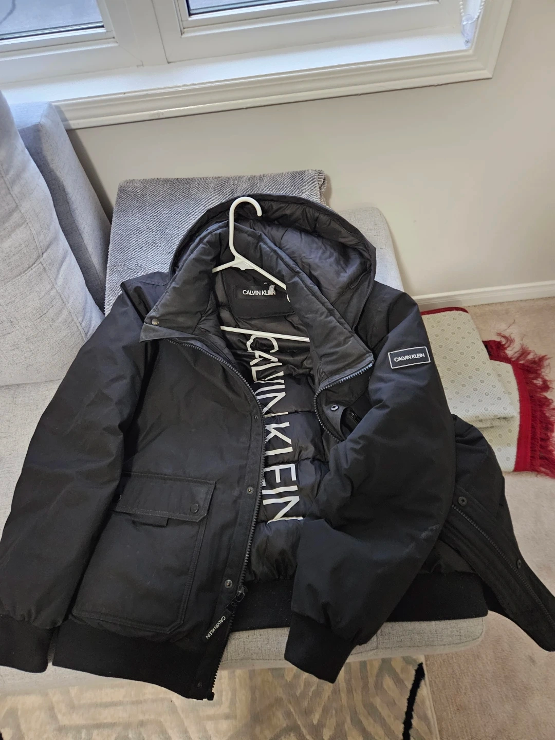 Selling a Calvin Klein puffer jacket in black. It's in great condition and perfect for the cold weather! The jacket features the Calvin Klein logo on the sleeve and a stylish design on the inside lining