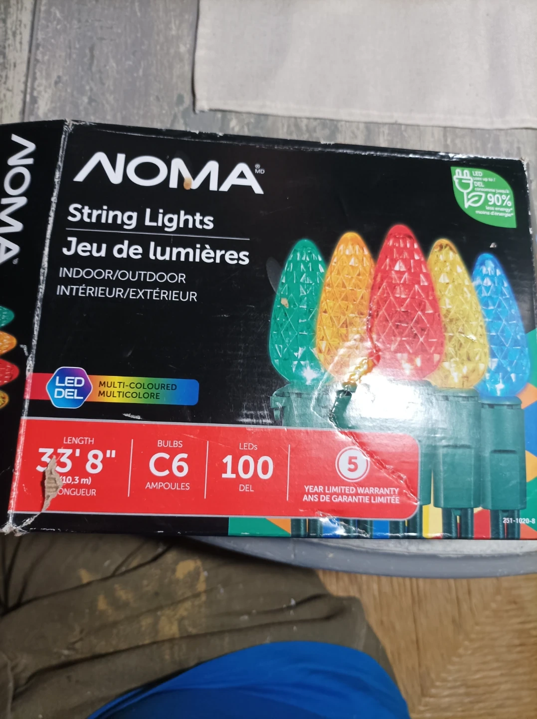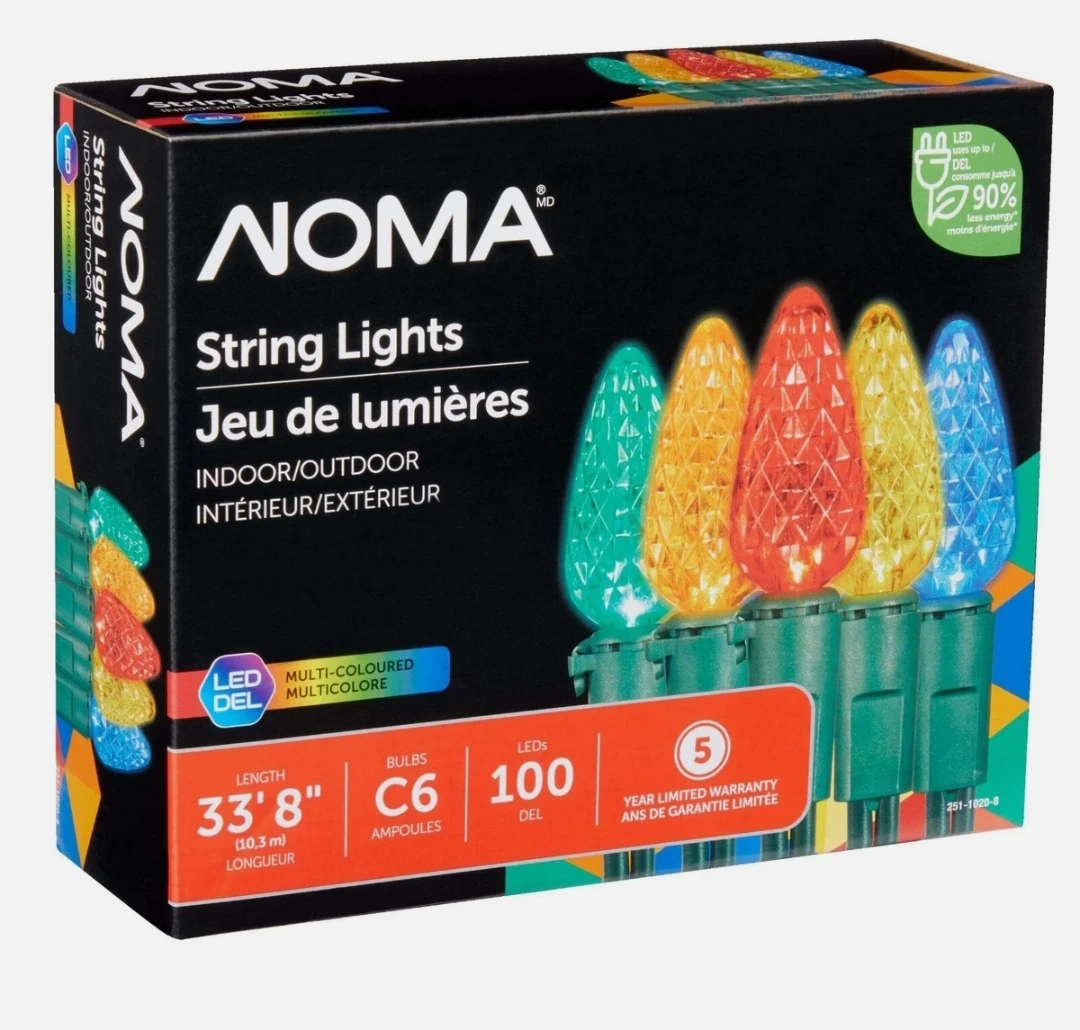 154Selling a set of NOMA string lights, perfect for adding a festive touch to your home, indoors or outdoors! These multi-coloured LED lights are energy-efficient, using up to 90% less energy. The string is 33'8" long and features 100 C6 bulbs. Box included!