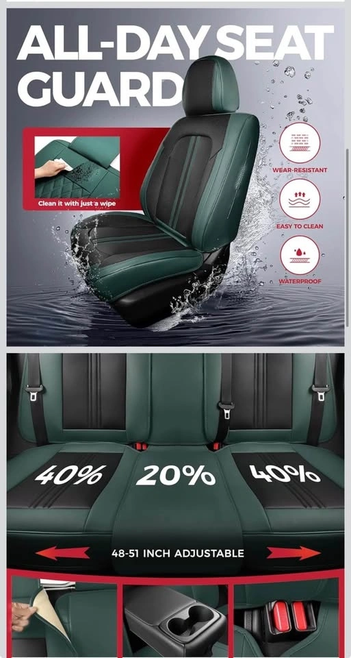 Brand new black and green car seat covers. Full set, universal fit for cars, trucks, and SUVs. Waterproof design for front and back seats. Protects your car seats. Fits most cars.