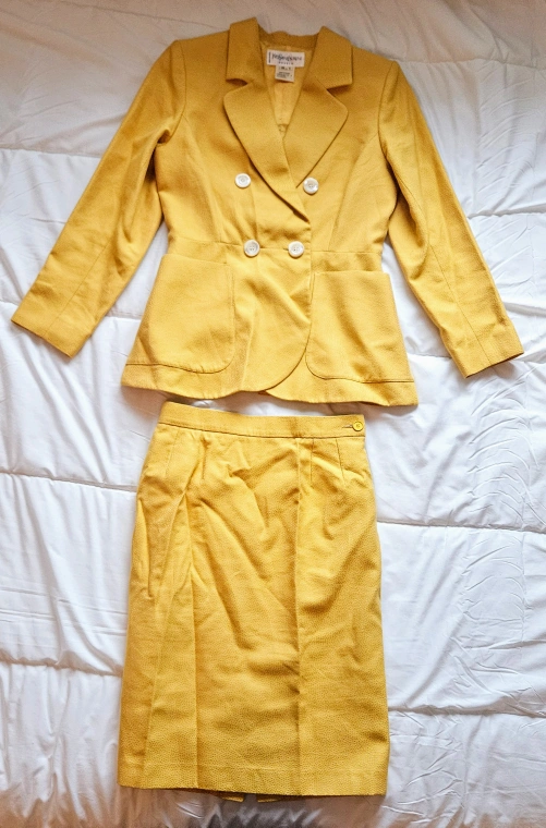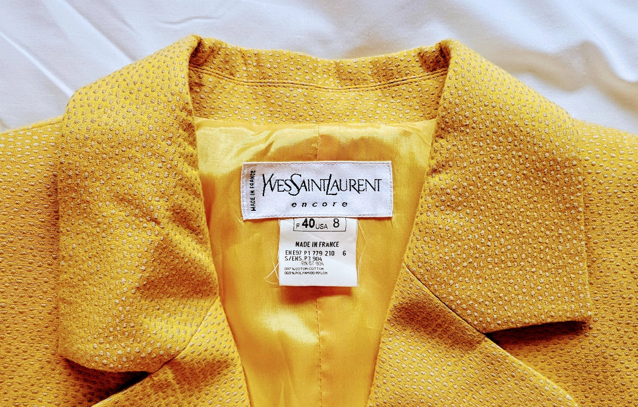 This vintage Yves Saint Laurent Encore blazer and skirt made in France size 8 is in excellent cond. There are no rips, tears, holes or stains of any kind.