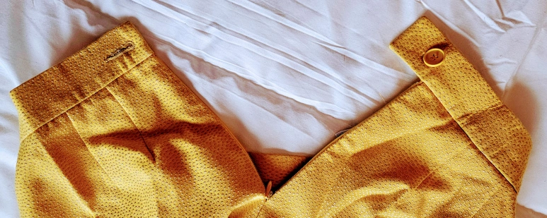 The fabric 97% Cotton and 3% Nylon and features yellow with grey woven dots.