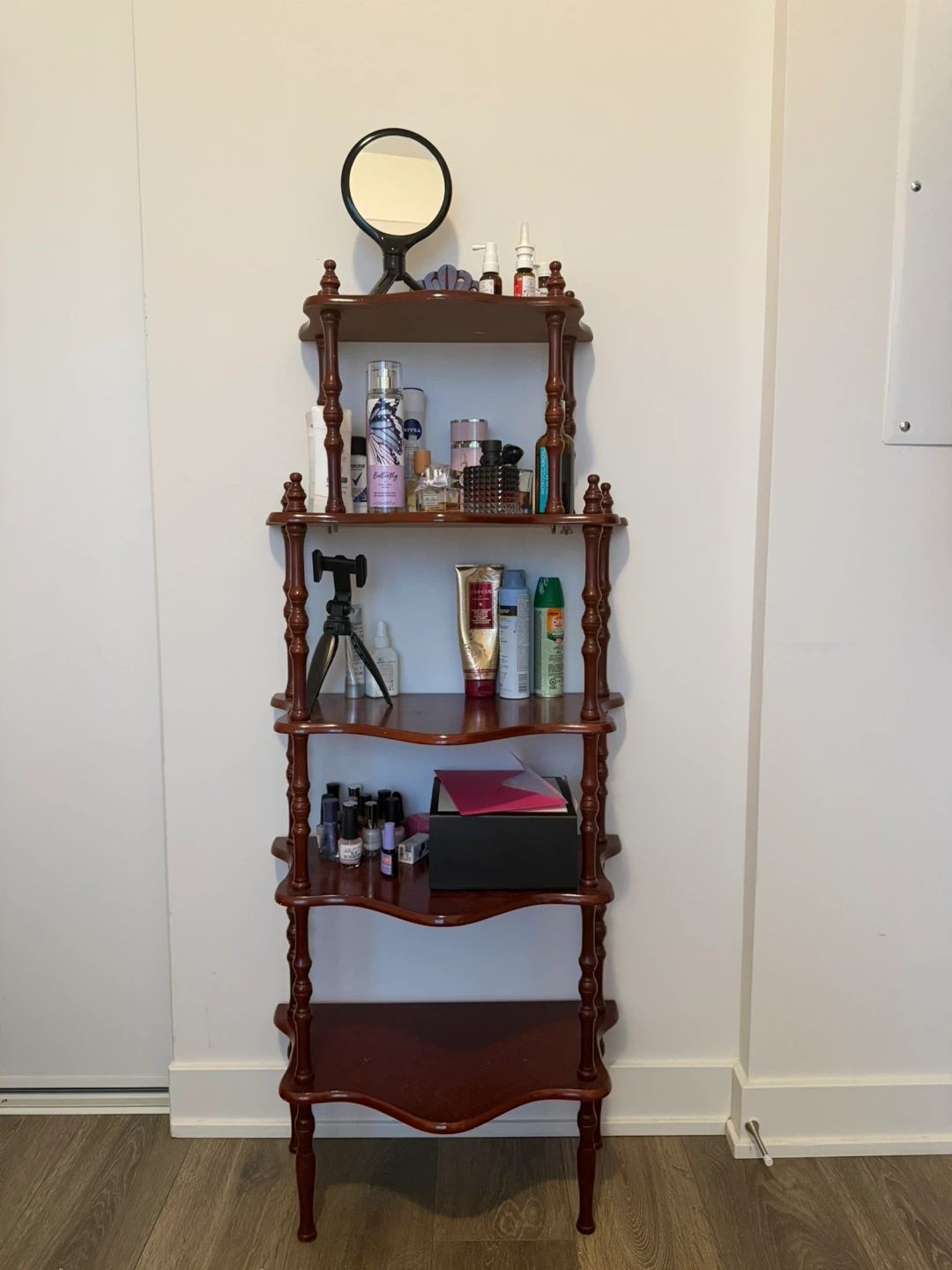 Selling a lovely wooden display shelf! It has five tiers, perfect for displaying your favourite items or organizing your space. The shelf is in great condition and has a classic, elegant look.
