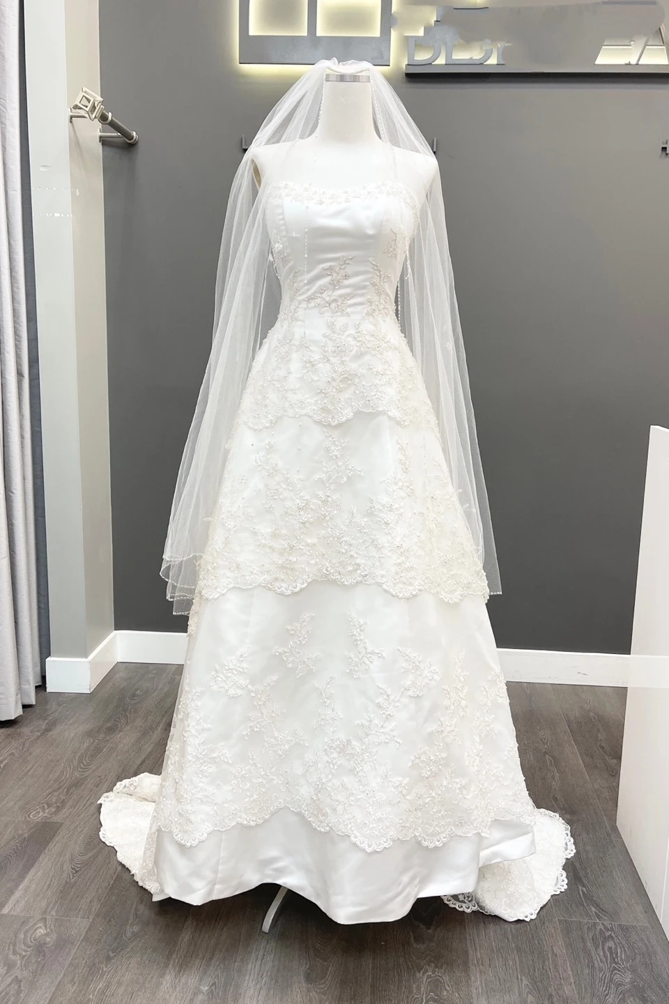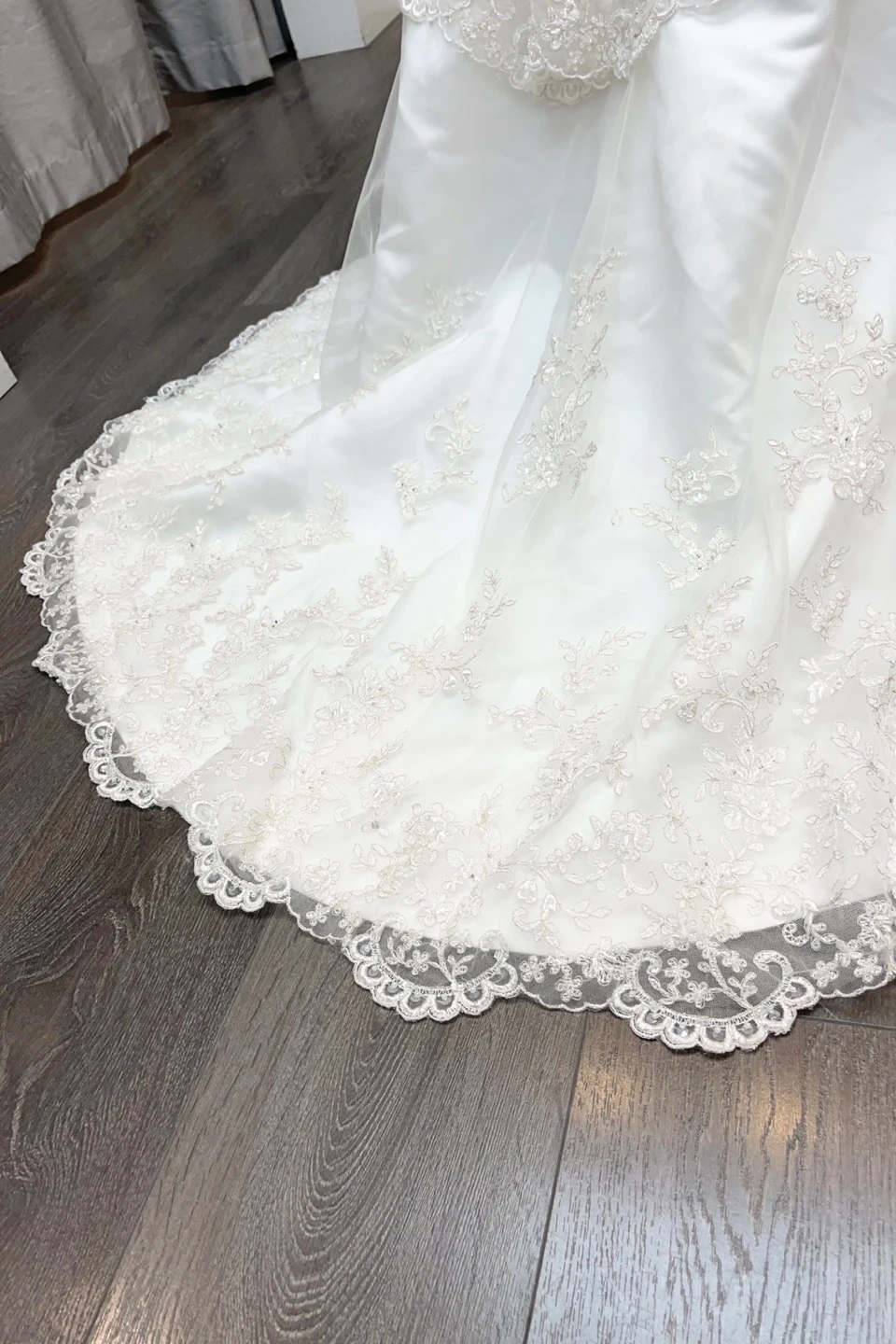 Beautiful white wedding dress with delicate lace detailing. Features a corset back and a layered skirt. Perfect for your special day!
