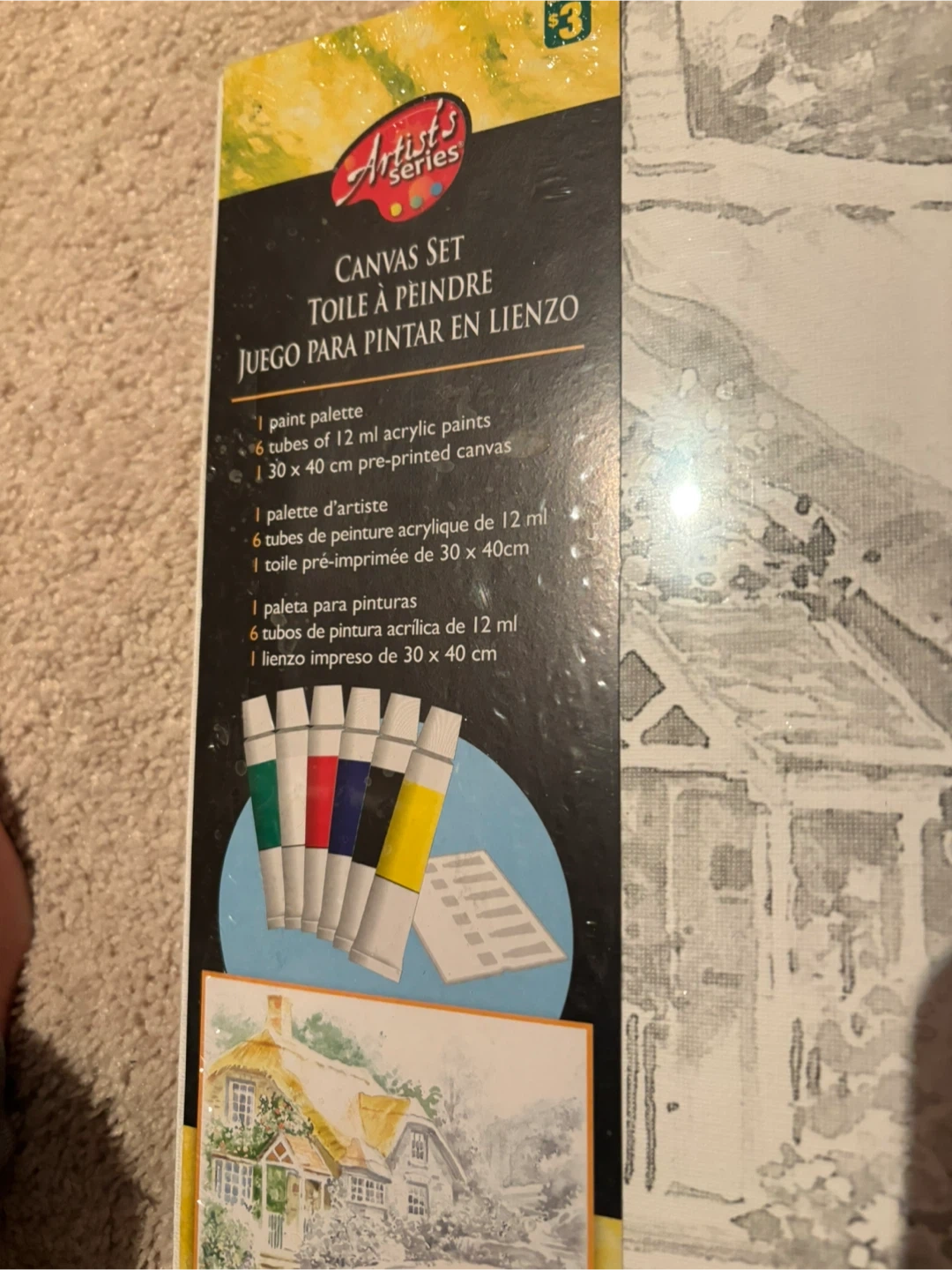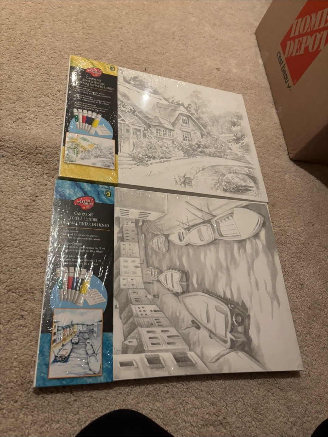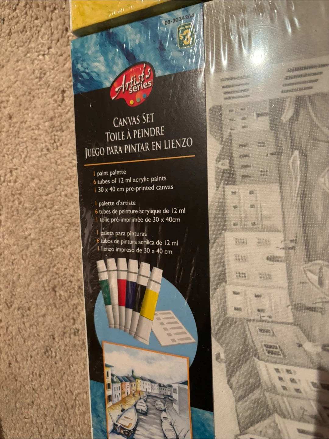 63X2 canvas with printed artwork that can be filled in with paint (comes with small paint tubes) X1 picture frame Both from dollarama and unopened!