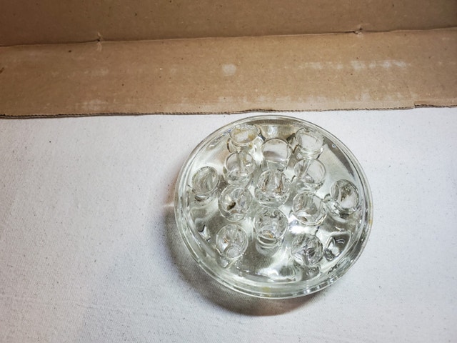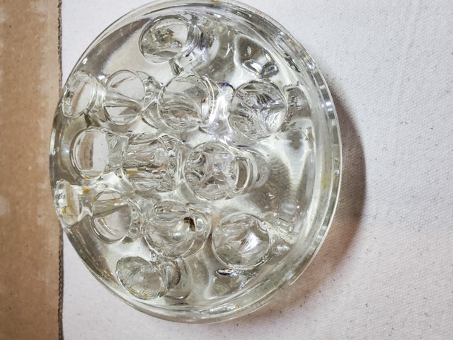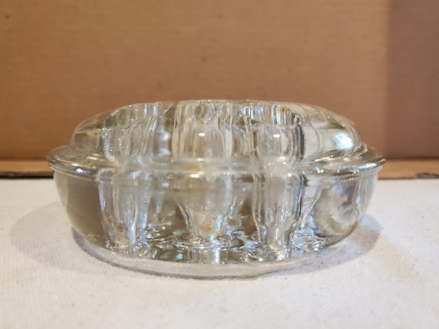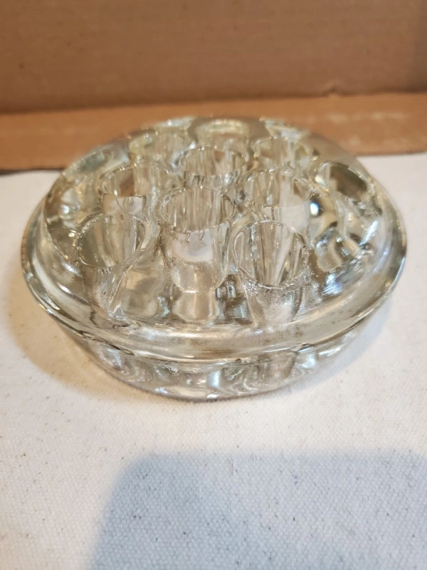 A nice heavy vintage glass frog. It is dome-shaped, standing about 2" tall, and 4.5" in diameter. It has 13 holes for flower stems.