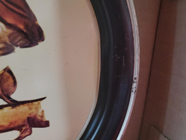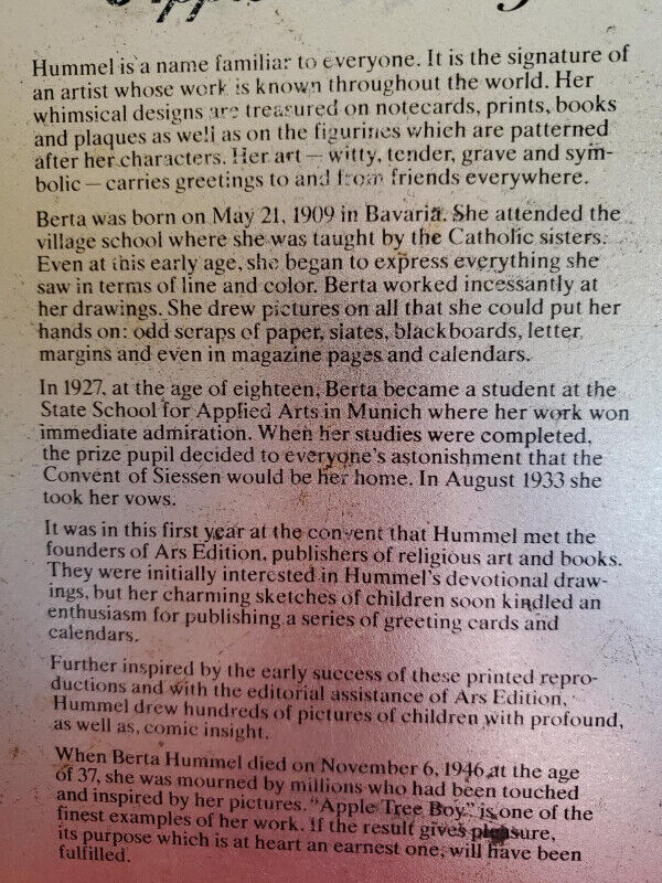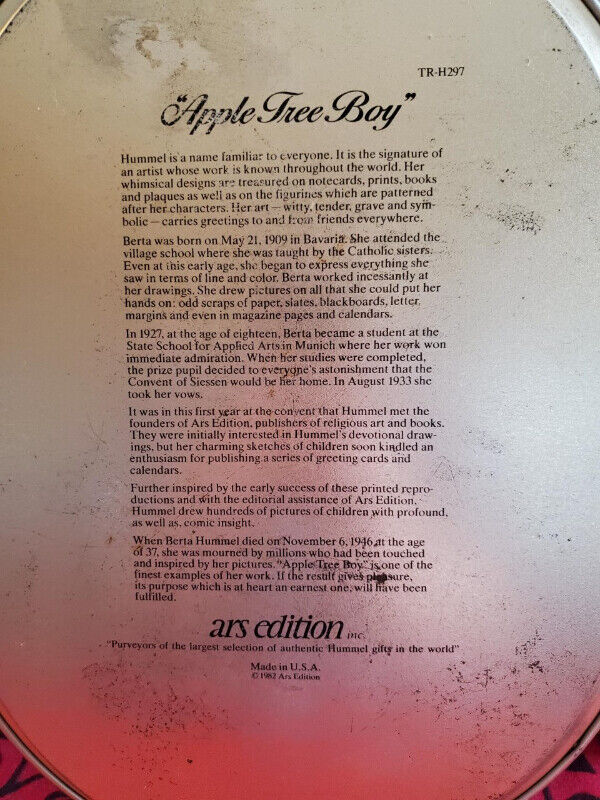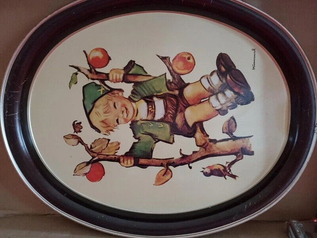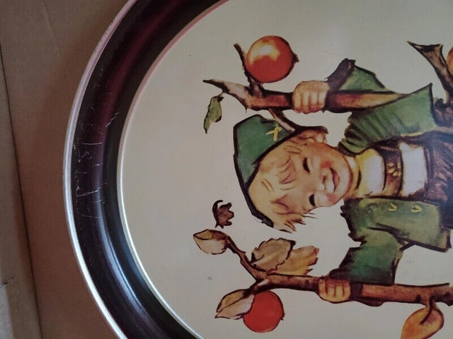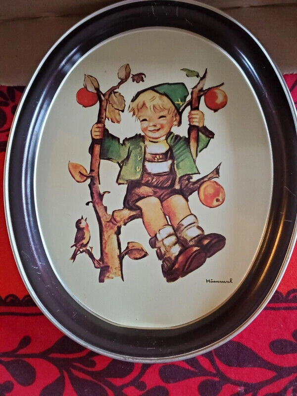 Small vintage tin tray, Hummel’s “Apple Tree Boy”. It’s a bit scratched on the border, and there are signs of wear on the back. Marked as made in the USA, ARS Edition copyright 1982. Dimensions: 14.5” long (37cm) x 11.5” wide (29.5cm). $5.00, pick up only.