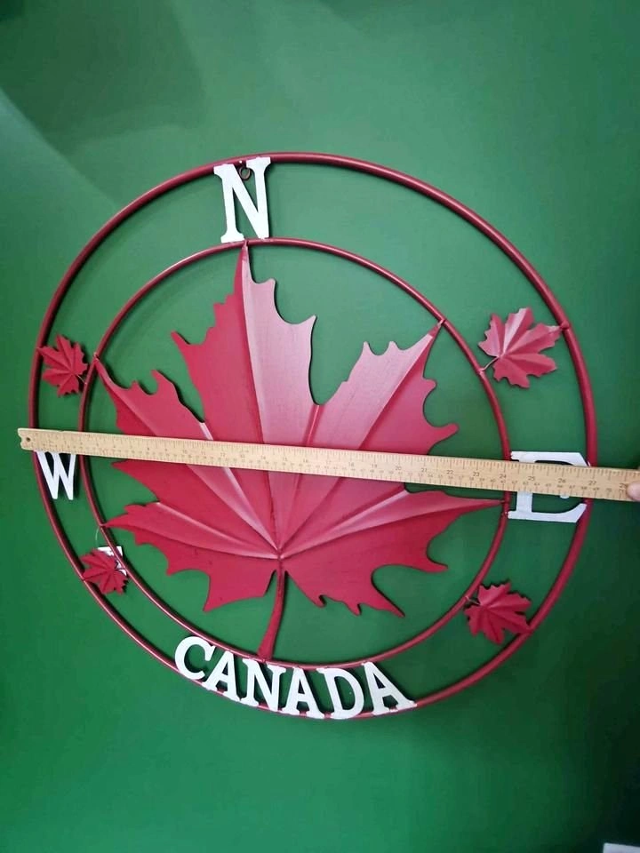 Perfect for hanging indoors or out, this beautiful piece of metal wall art featuring the maple leaf and the word CANADA emblazoned across the bottom of the compass circle.