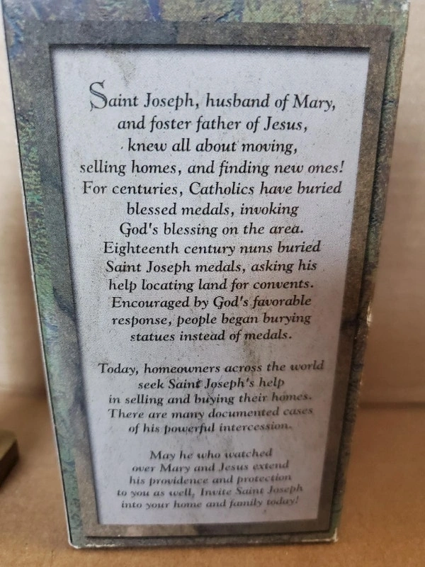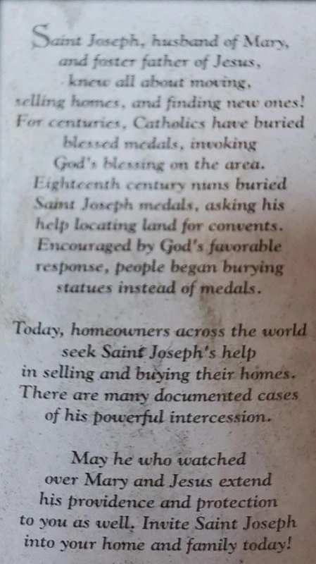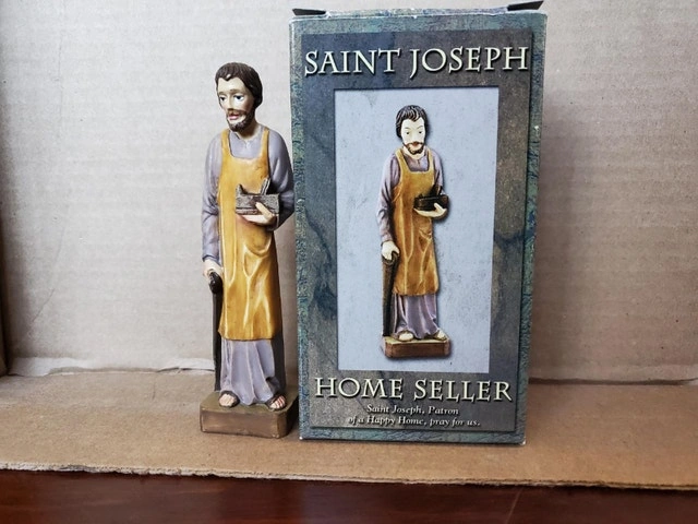I have a St. Joseph Home Selling Kit - well, just the figure of St. Joseph and the box. You bury St. Joseph in your yard and it helps sell your house. The instructions are missing, but I'm happy to download the prayers and directions for you. Will throw in a St. Jude medal (patron saint of lost causes) if you've got a particularly tough property to sell. For $5.00, why not? Pick up only.