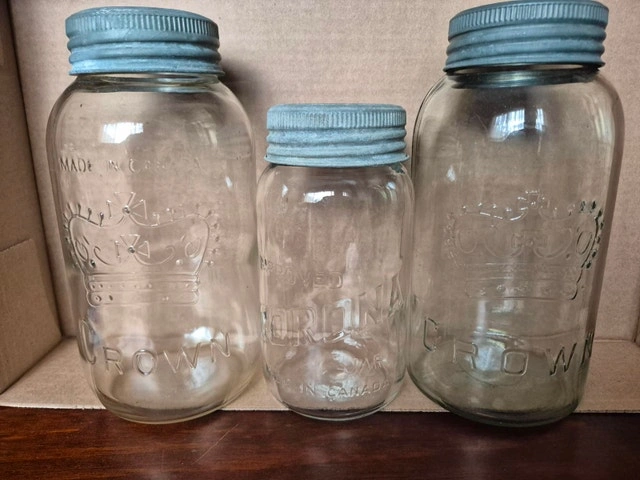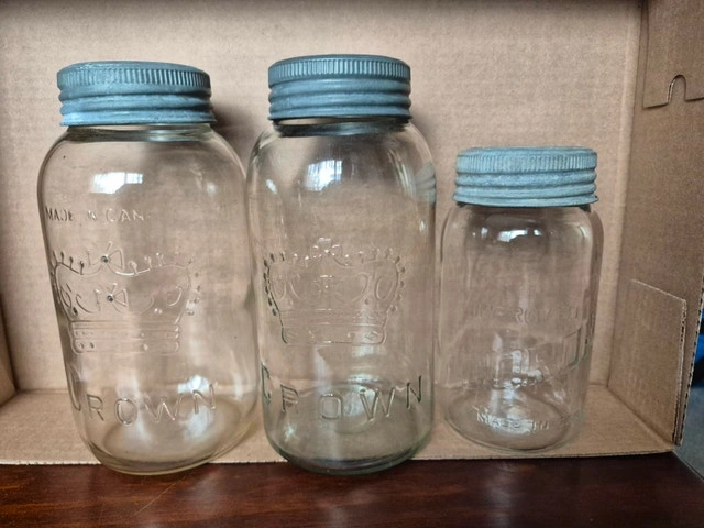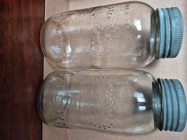 I have 2 vintage crown mason jars (canning jars) in the 2 quart size - $10.00 each. I also have a few 1 quart Corona and Crown jars at $5.00 each. Pick up only.