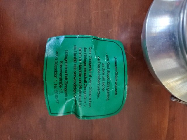 A small pewter cream and sugar set, never been used. It's by Baecker & Zinn, about 2.5" tall, with the creamer about 4.5" long, and the sugar bowl, about 5" wide - including the handles.