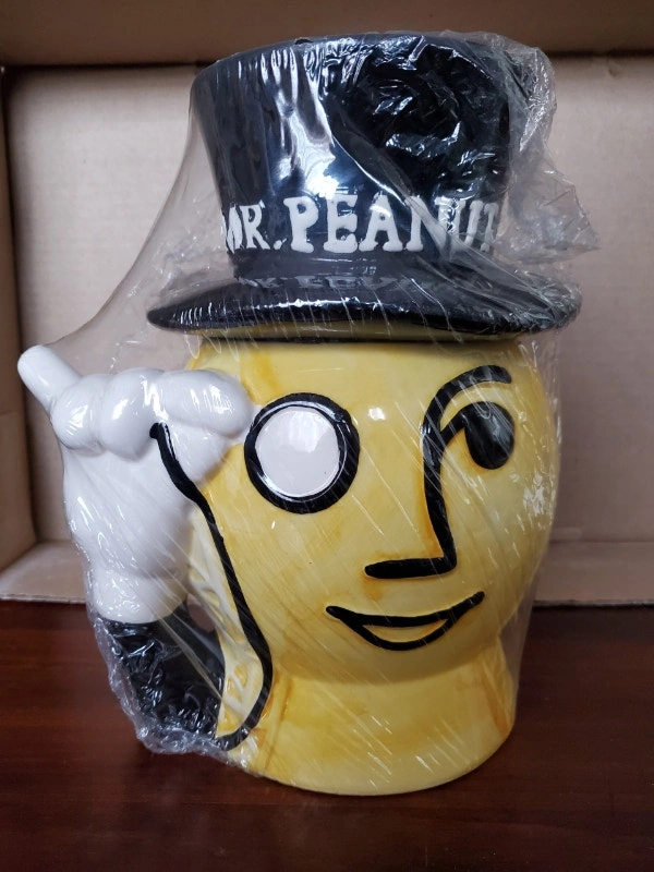 A new, still sealed "Mr. Peanut" ceramic cookie jar. It stands about 9.5" tall and is about 8" at its widest point. Still contains peanuts, but they are definitely inedible by now. $25.00 firm, pick up only.