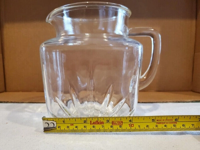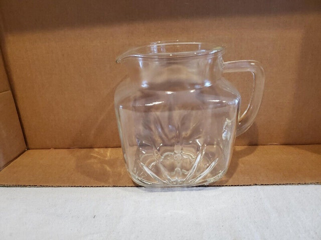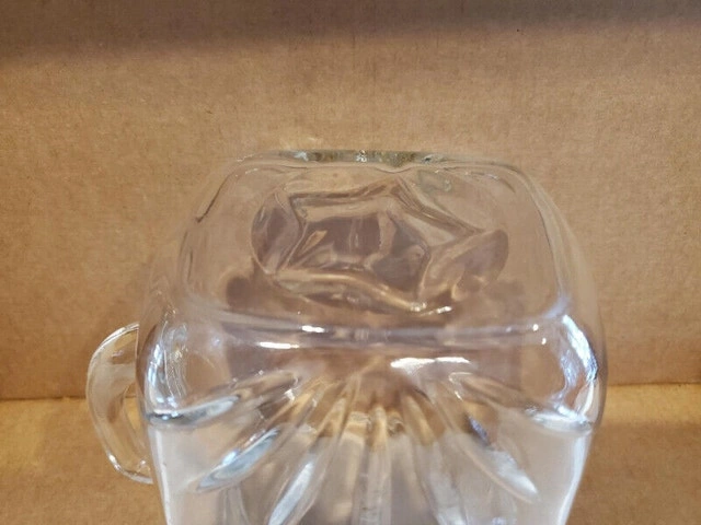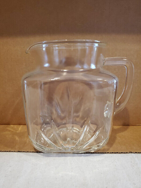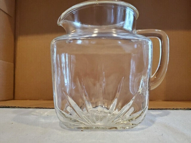 Good condition vintage Federal glass pitcher. It's got a lovely starburst design on front, with a star stamped on the bottom. It's the smaller of the standard federal pitchers - about 6" high and 4" wide. $10.00, firm, and pick up only.