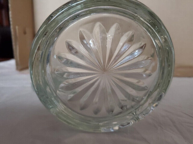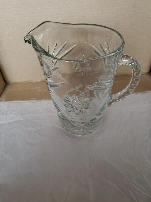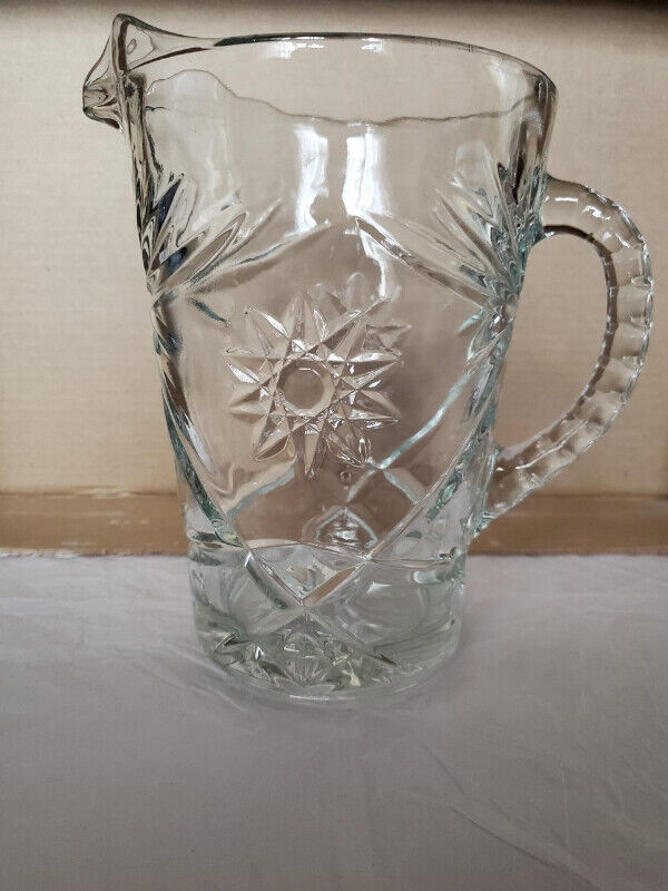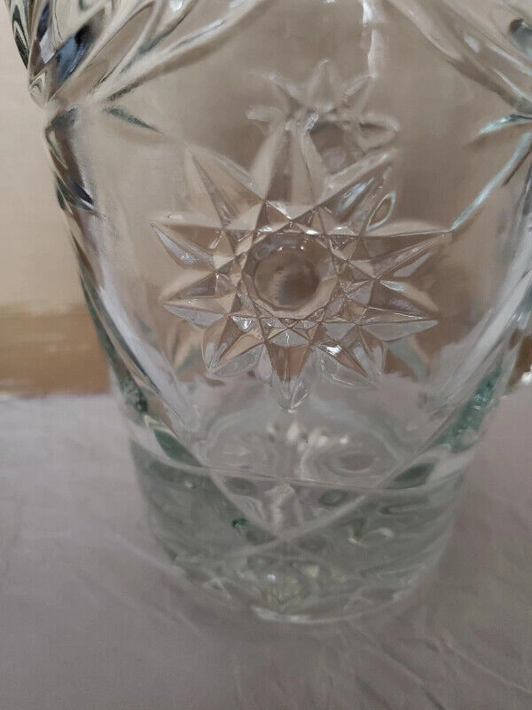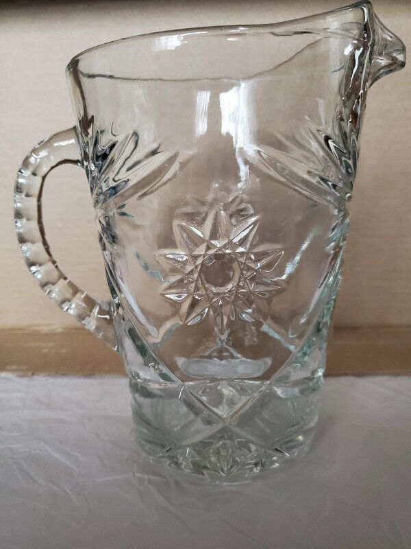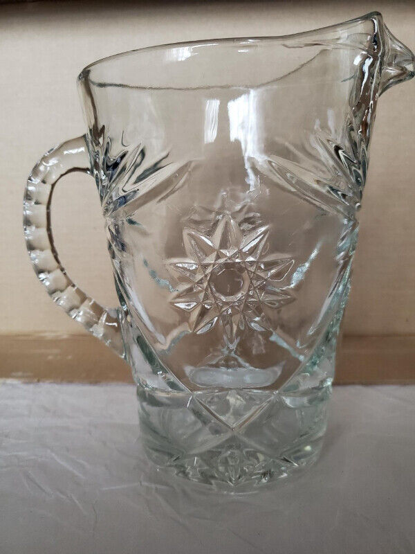A lovely clear glass vintage water pitcher by Anchor Hocking in the star pattern. The pitcher is really heavy pressed glass with deeply engraved patterns. It stands about 8” high and holds about 54 ounces. $20.00, pick up only.