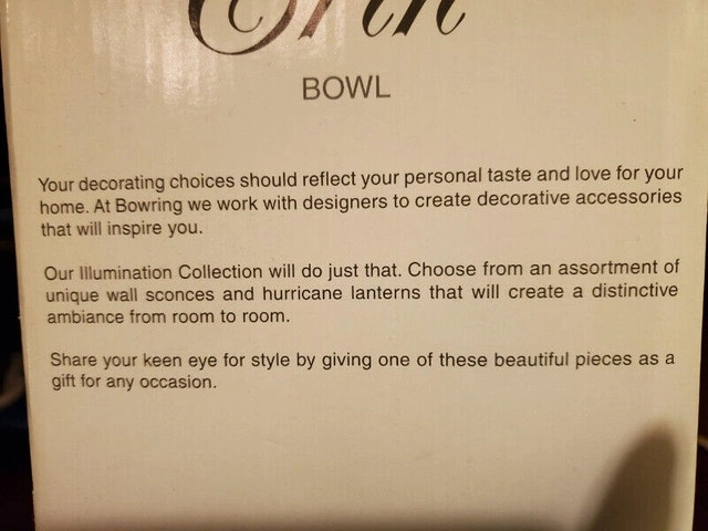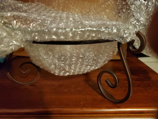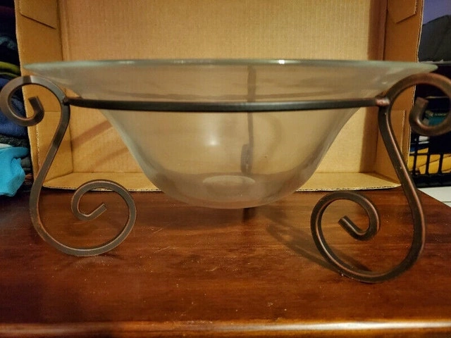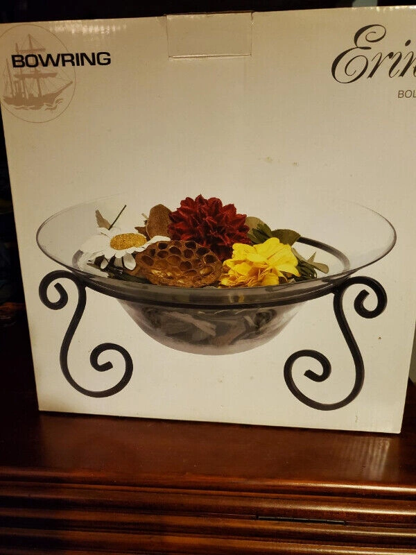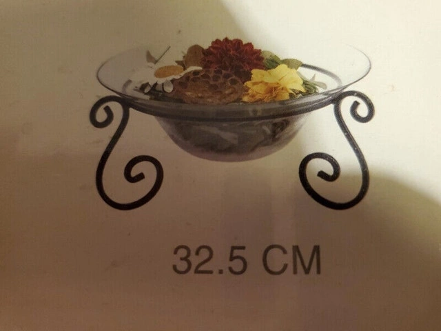 New in box, the glass bowl and iron stand is from Bowring, model name Erin and is 32.5cm in diameter. Comes with Potpourri, $5.00 for bowl and potpourri, pick up only.
