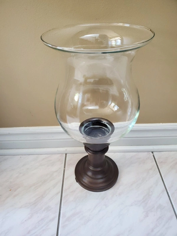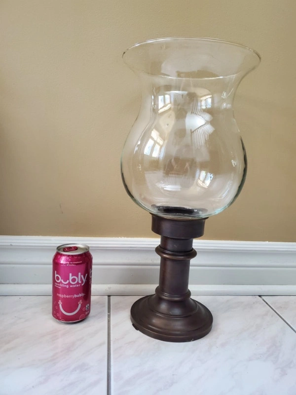 Really nice, large hurricane style candle holder. It's got fairly heavy metal base and a lovely glass chimney. Shown next to a pop can for scale, it stands about 17.25" tall and is about 8.5" at its widest point. $15.00, pick up only.