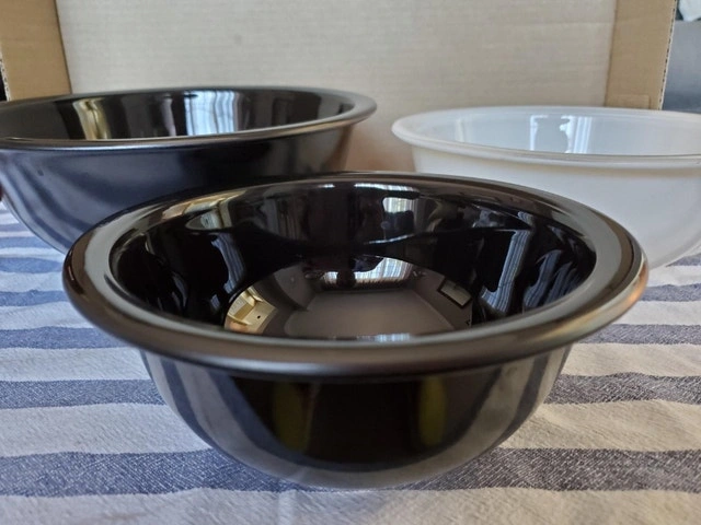 A set of 3 black & white nesting bowls, with clear bottoms – the largest and smallest are black, the middle bowl is white. They’re in very good shape - $40.00, firm, for the set, pick up only. Large bowl #325, black 2.5 litre Medium bowl #323, white, 1.5 litre Small bowl #322, black, 1 litre