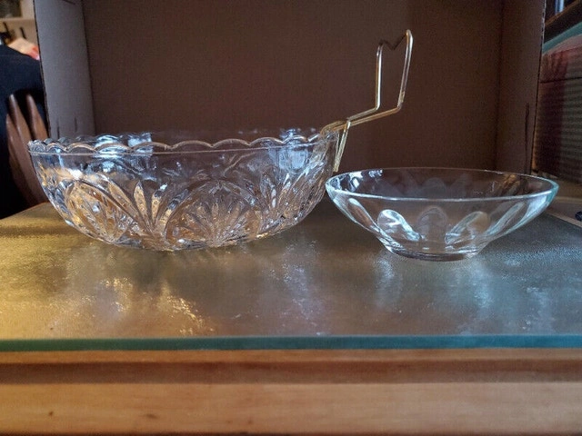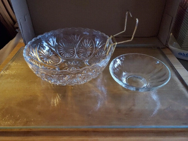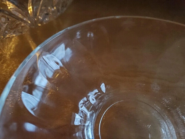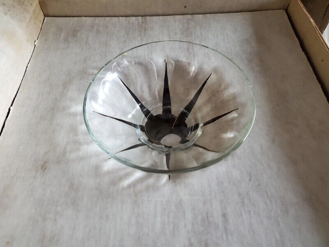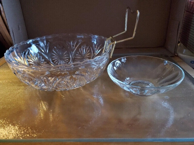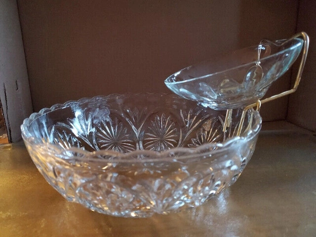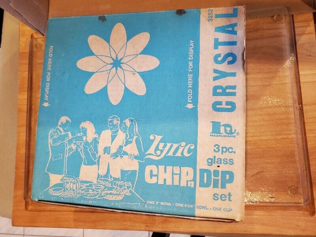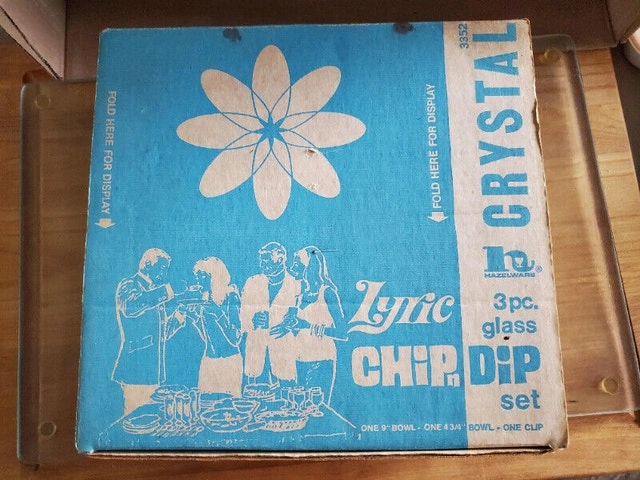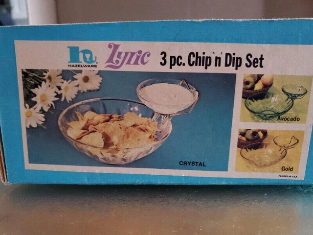 10Vintage Chip & Dip set, the Lyric model in Crystal by Hazelware. It's a 3 piece set - one 9" chip bowl, brass holder and a 4.75" dip bowl. There is a fleabite chip in the dip bowl (where it rests against the bracket). Chip is hard to see, but I tried to capture it in the last picture. In the original box. $15.00, pick up only