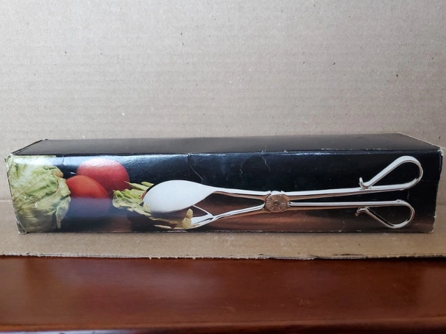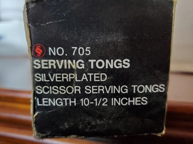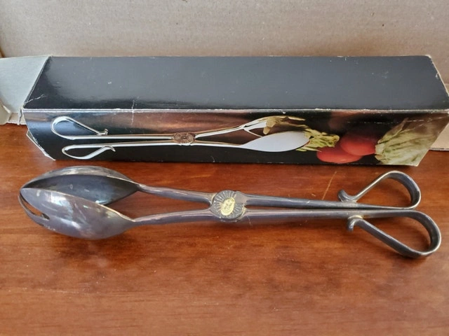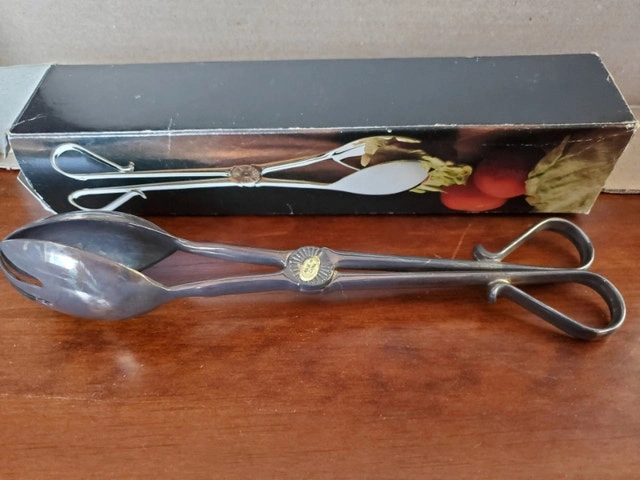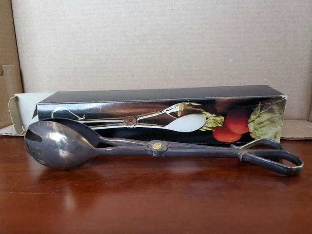 10A pair of silver-plated salad tongs. They're 10.5" long, and really need polishing. $3.00, pick up only.