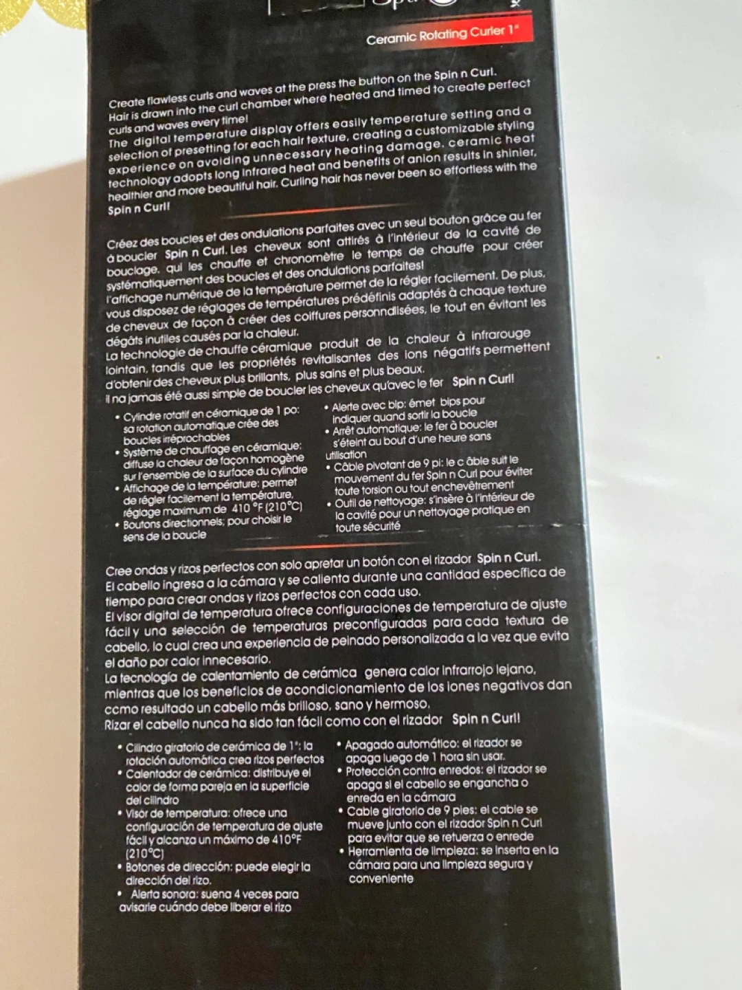 I'm selling a brand new Spin N Curl ceramic rotating curler. It features a ceramic rotating barrel for flawless curls and a ceramic heater that distributes heat evenly for shinier, healthier hair.