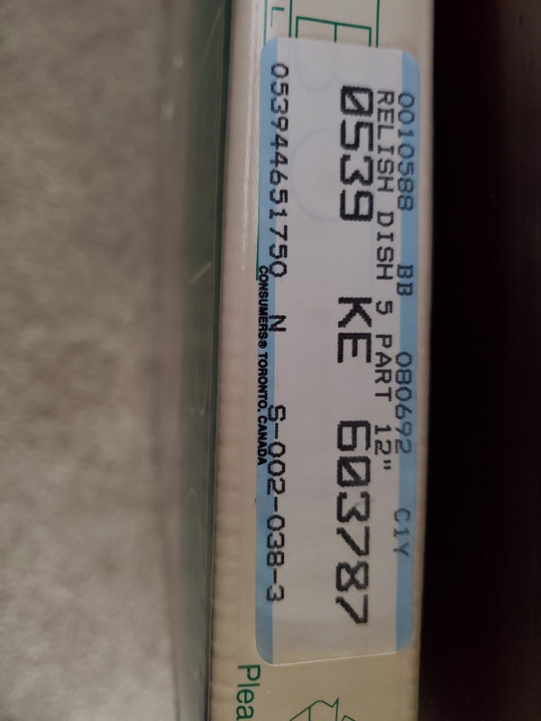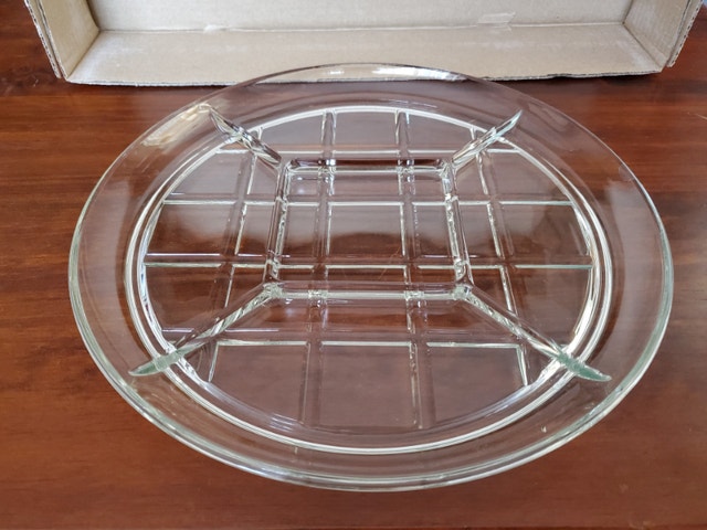 One vintage relish tray by Indiana Glass in the Gazebo pattern. Perfect condition, comes in the original box. It's a 12" relish tray with 5 sections. $15.00, pick up only.
