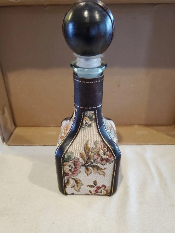 10Two decanters are available: 1. Small Crystal or Glass Decanter - 8" tall including stopper, base is 2.5" x 2.5" - $5.00 4. Fabric covered decanter with a wooden stopper - about 9.25" tall, base is 4" x 4" - made in Italy - $5.00 No chips or cracks, pick up only.