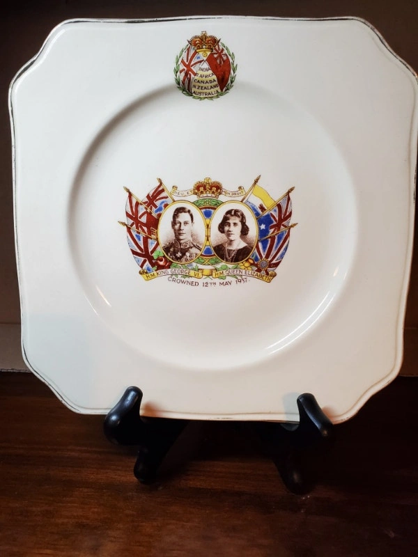 10Good condition vintage plate commemorating the 1937 Coronation of King George VI. It's square, about 8" x 8", no chips or cracks. Marked "Empire - Shelton Ivory England" on the back. $10.00, pick up only.