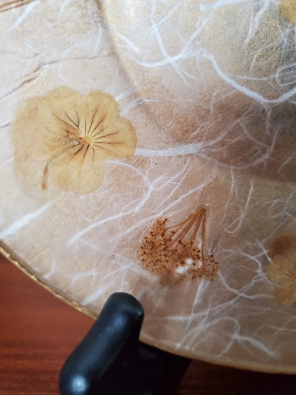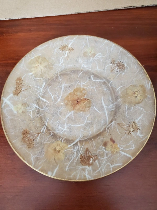 An interesting glass plate with dried flowers. It's small - about 8" in diameter, glass with dried flowers sealed in with a gold/brass coloured backing and the same colour around the rim. $5.00, pick up only