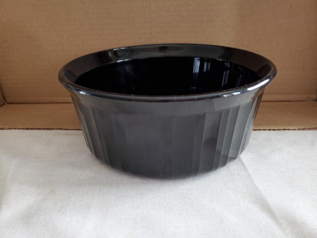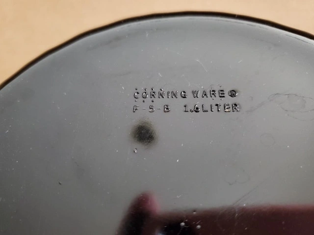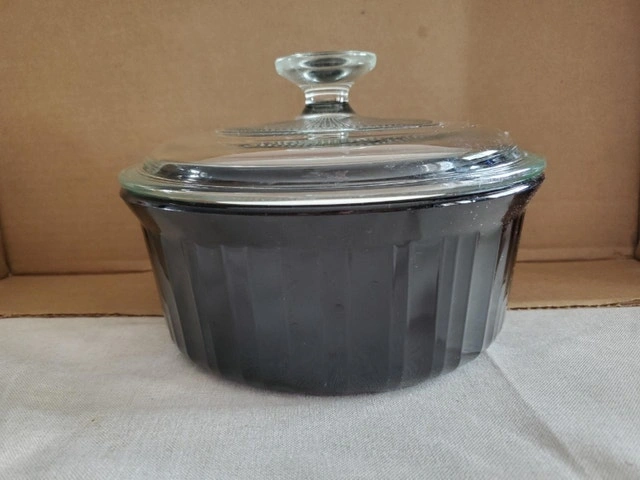 A vintage corning ware casserole dish with pyrex lid. It's in the French Black pattern, 1.6 litre size, model number F-5-B. $20.00, pick up only.