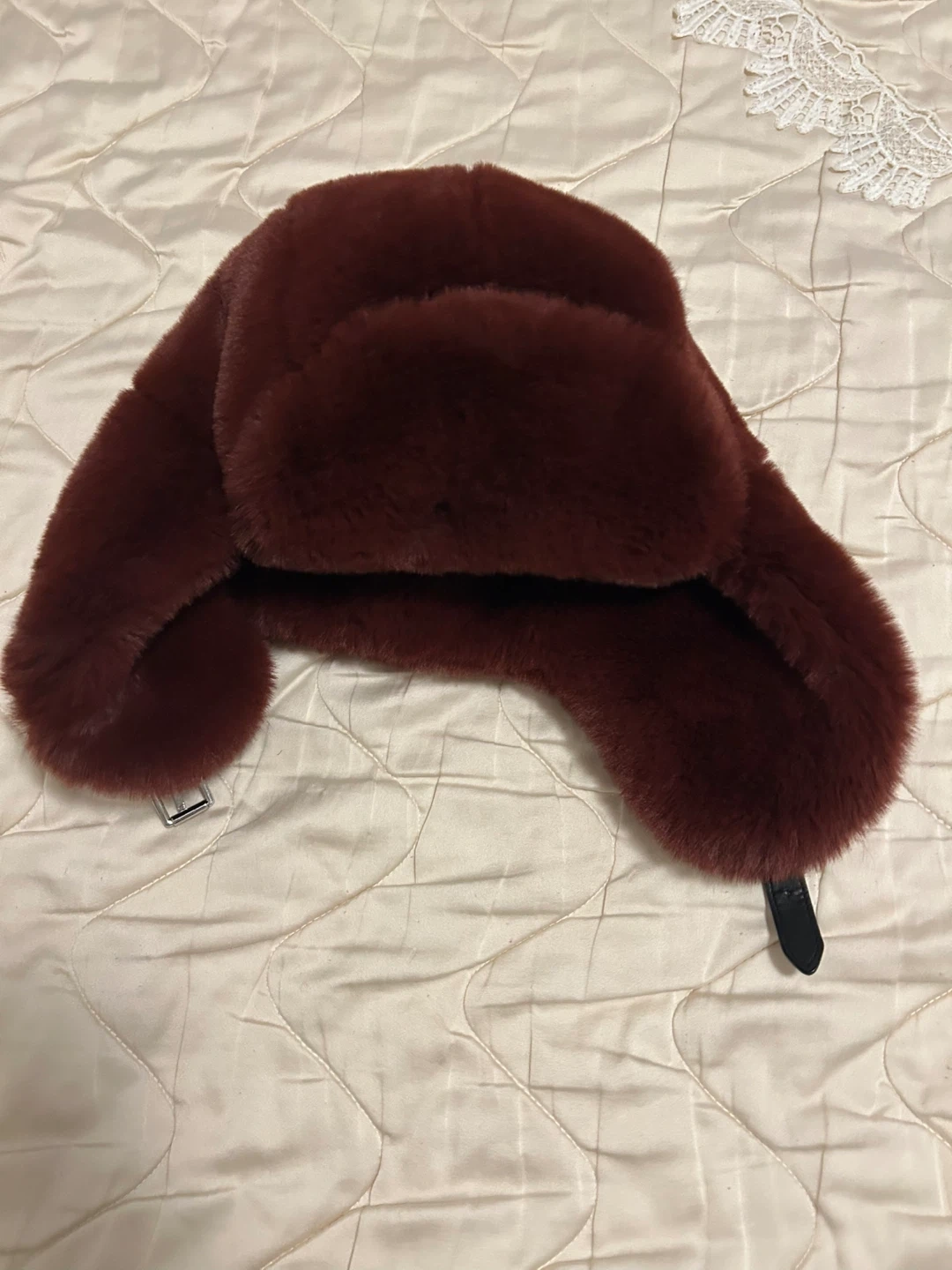 Cozy up with this stylish Michael Kors faux fur trapper hat! It's a beautiful burgundy colour. This hat is sure to keep you warm and fashionable during the colder months. Worn 2 times