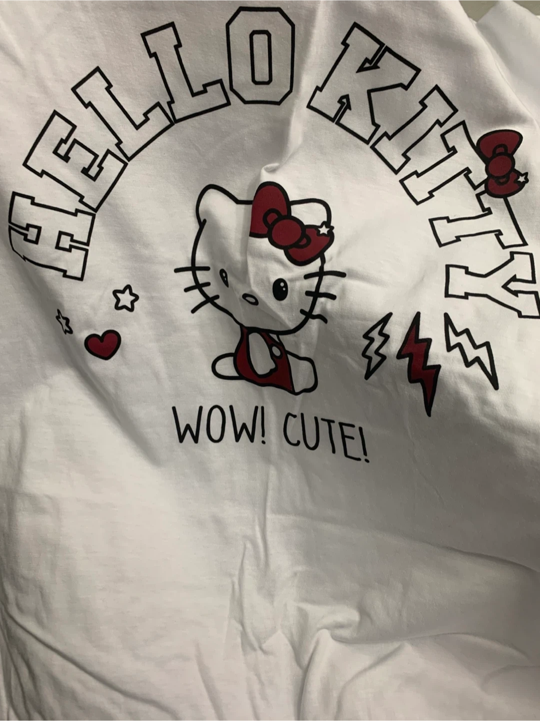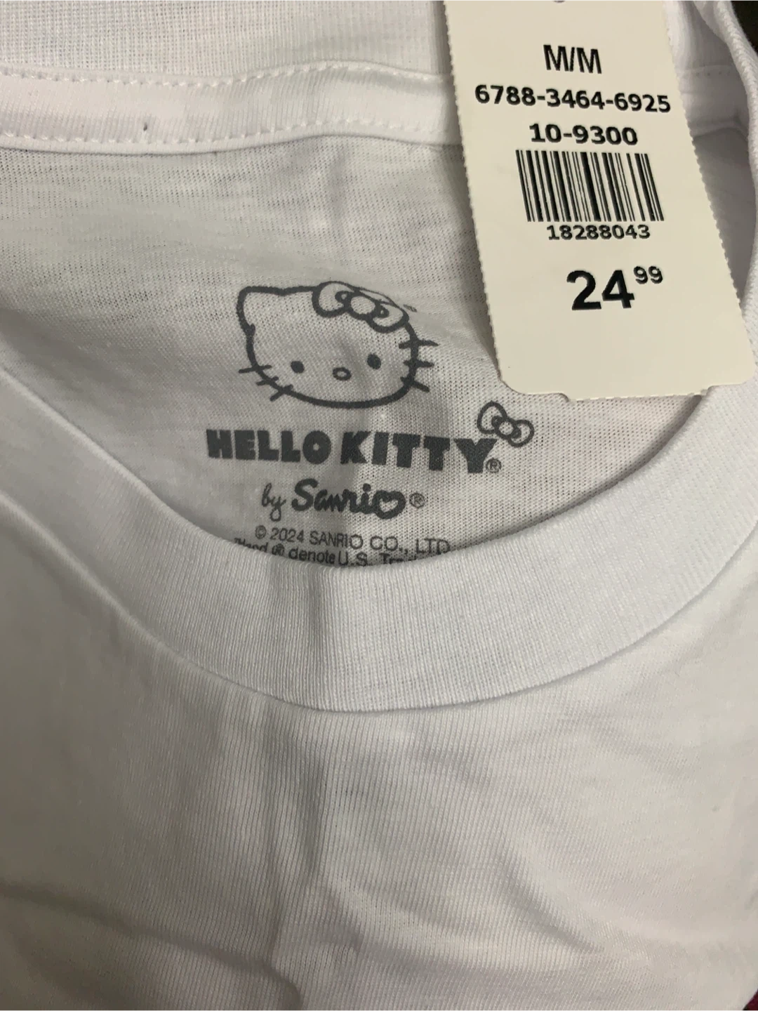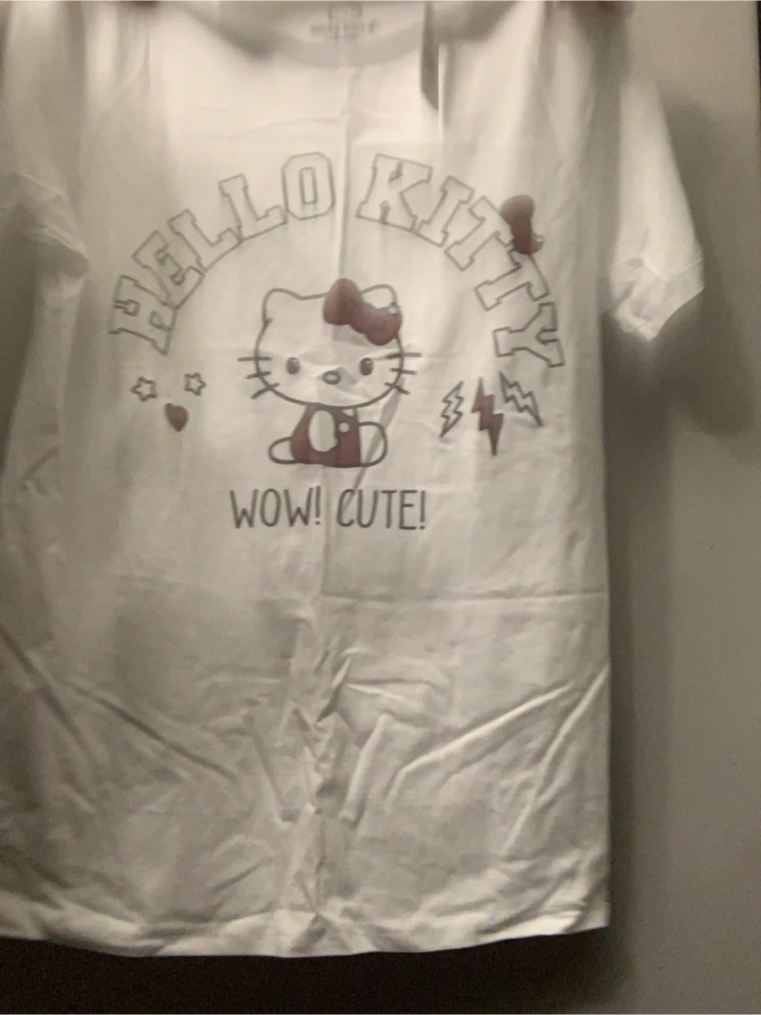Selling a cute Hello Kitty t-shirt by Sanrio! It's white and size M/M. The design features Hello Kitty with "WOW! CUTE!" printed below. Originally bought for $24.99
