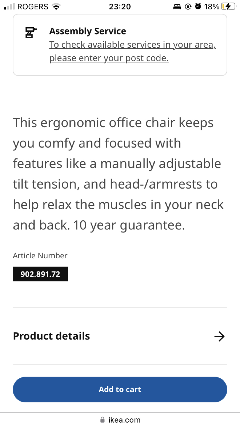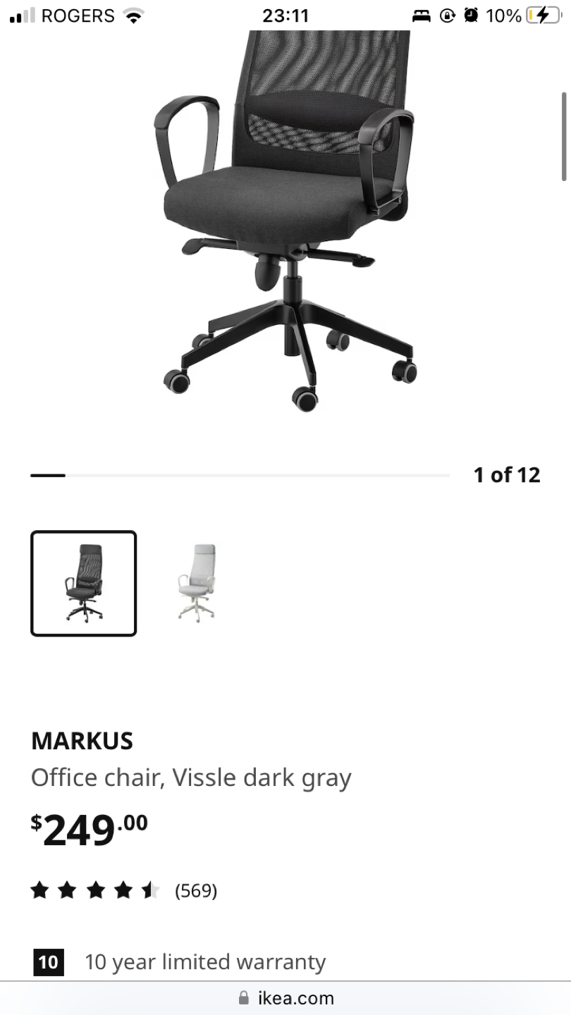 IKEA MARKUS office chair dark gray colour. Ergonomic design. Adjustable height and tilt back. Adjustable tilt tension. Lumbar support. Used for 2 years only. 10 year warranty. Very clean and like new.