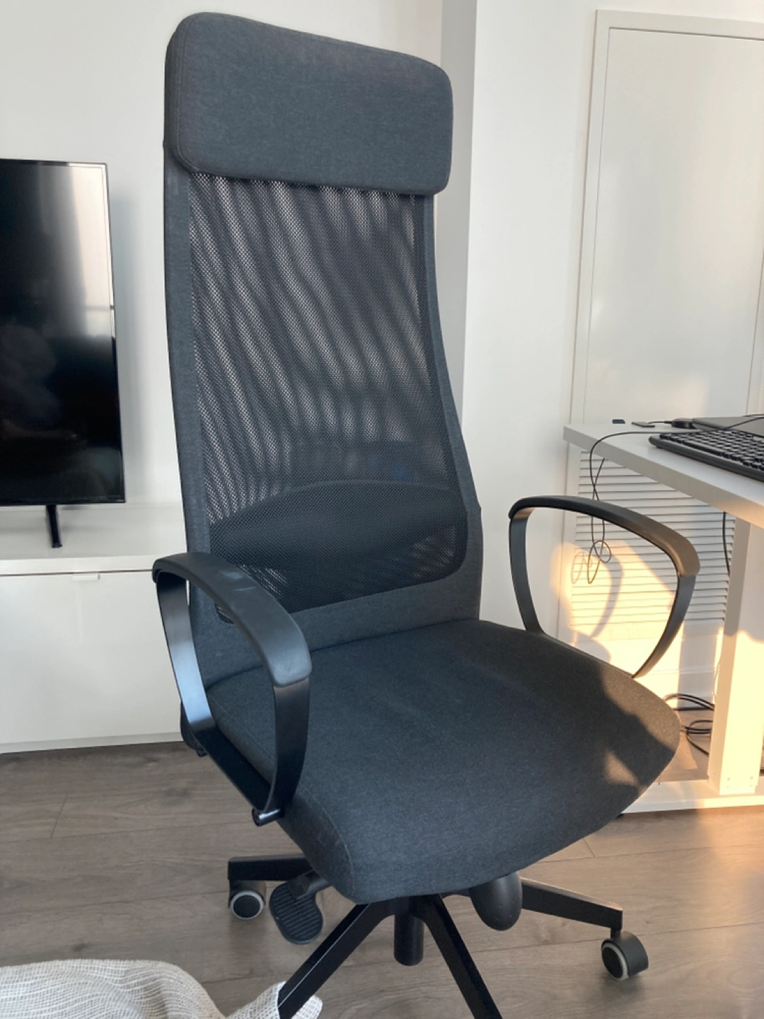 IKEA MARKUS office chair dark gray colour. Ergonomic design. Adjustable height and tilt back. Adjustable tilt tension. Lumbar support. Used for 2 years only. 10 year warranty. Very clean and like new.