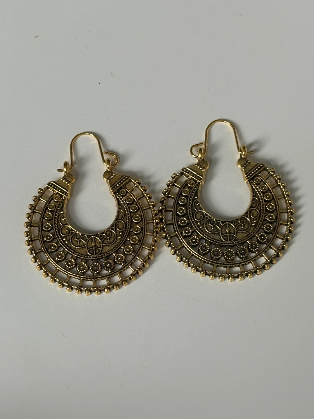 A beautiful pair of golden boho hoop earrings. They feature a detailed, patterned design, perfect for adding a touch of flair to any outfit!