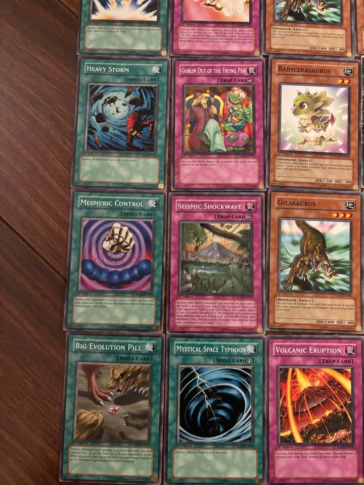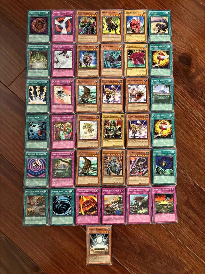 60RAWR! Unleash the prehistoric power with this ultra-rare 2002 Japanese “Miracle Jurassic Egg” promo pack—fully opened and complete! If you’re a Dino deck builder, OCG collector, or just love classic YGO nostalgia, this is your fossil find. What’s Included: • 37 Near Mint cards from the limited Japanese promo (all Dinosaur-themed beaters & support) • Highlights: Black Tyranno (2600 ATK beast!), Ultimate Tyranno (3000 ATK king!), Super Conductor Tyranno (burn damage terror), Gilasaurus x2 (swarm starter), Babycerasaurus, Dark Driceratops, Sabersaurus, Kabazauls, Hyper Hammerhead, Tyranno Infinity + more monsters! • Spells/Traps Galore: Mystical Space Typhoon, Heavy Storm, Lightning Vortex, Jurassic World (Dino ATK boost!), Big Evolution Pill, Magical Mallet, Sebek’s Blessing, Negate Attack, Survival Instinct, Fossil Excavation, and tons more staples. • Bonus: Original Miracle Jurassic Egg pack wrapper (collectible art—hard to find intact!) These are authentic OCG Japanese prints from the golden era (2002-2005)—perfect for building a retro Dinosaur deck or completing your vintage collection. Condition is excellent: crisp edges, no bends, stored sleeve-free but carefully. Total market value ~$40-50 USD, but selling as a themed lot for convenience. Why Buy? Dino archetype is roaring back in modern play (thanks to reprints), and early promos like this are disappearing fast. Great starter for new players or gift for YGO vets! DM for more pics, close-ups, or questions. let’s get these Dino's stomping!