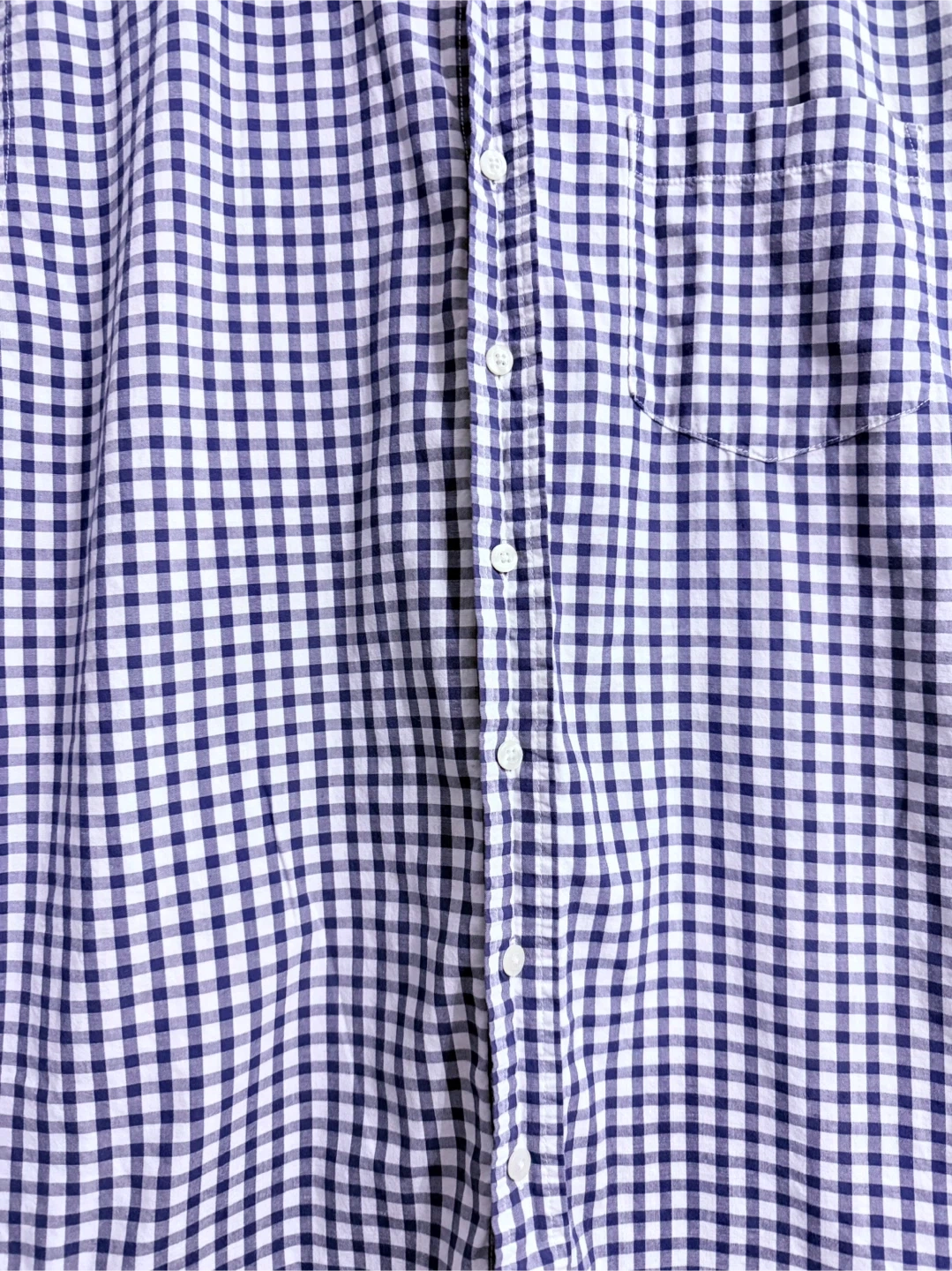 Gently used Gap short-sleeved shirt in a blue and white gingham pattern. It's a men's size XL and has a slim fit. Perfect for a casual look!