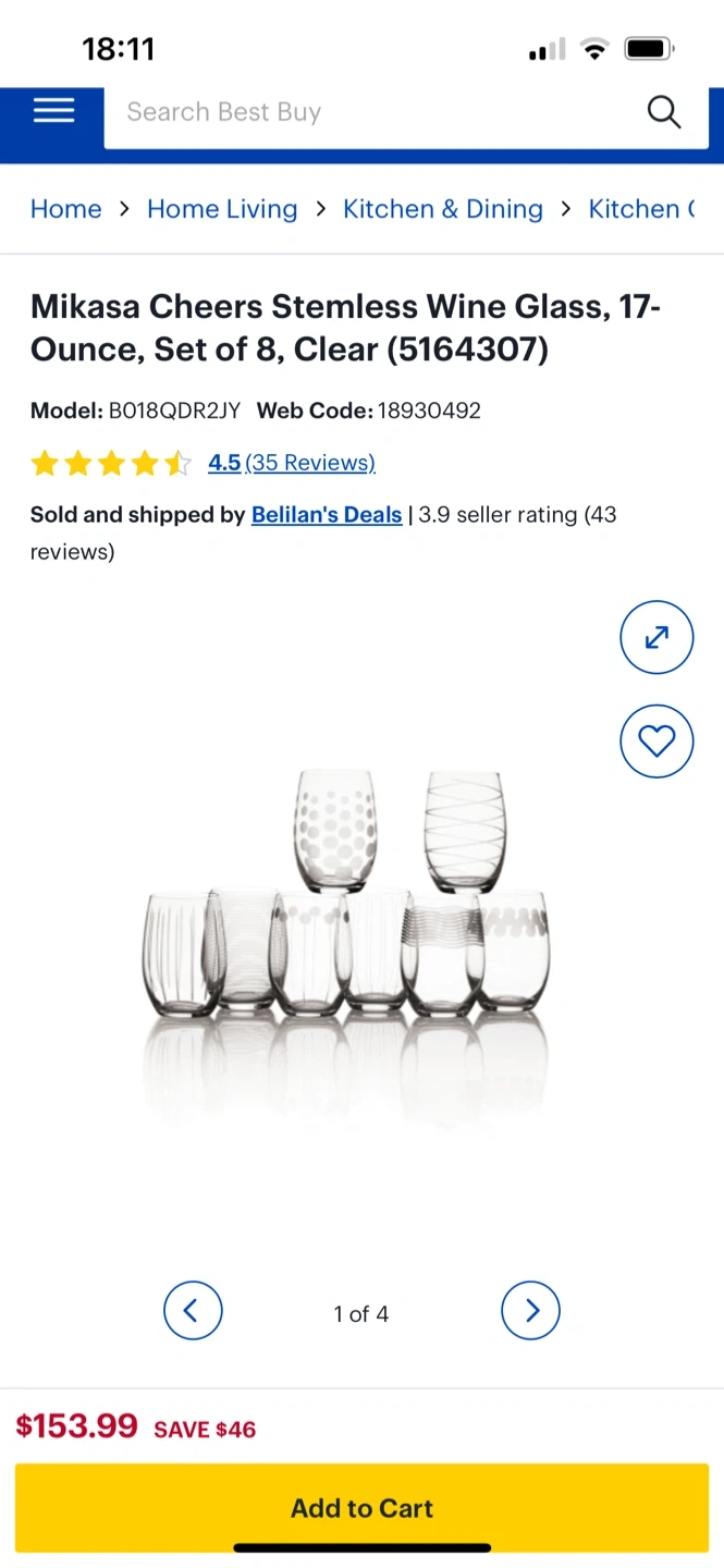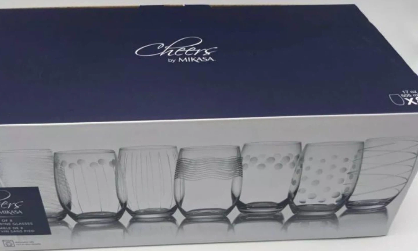 Selling a set of 8 Mikasa Cheers stemless wine glasses. These are clear, 17-ounce glasses. They come in their original box. These are perfect for entertaining or everyday use!