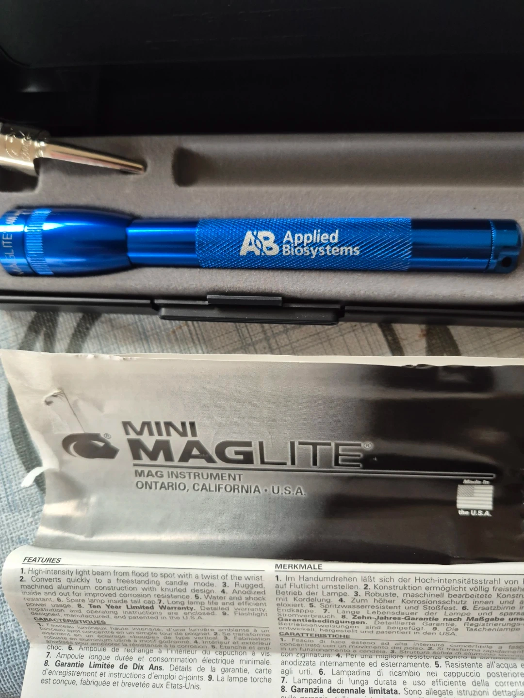 Selling a Mini Maglite flashlight in blue. It's in great shape and comes with its original box. This flashlight features a high-intensity light beam that adjusts from flood to spot with a twist of the wrist. It can also convert to a freestanding candle mode. The construction is rugged, with machined aluminum and an anodized interior and exterior for improved corrosion resistance. It's water and shock resistant and includes a spare lamp inside the tail cap