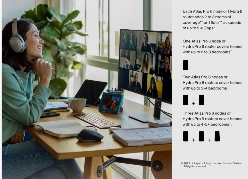 Selling a Linksys Atlas Pro 6 MX5503 WiFi 6E Mesh Router. Each node adds 2 to 3 rooms of coverage or 1 floor at speeds of up to 5.4 Gbps. One node covers homes with up to 2 to 3 bedrooms, two nodes cover homes with 3-4 bedrooms, and three nodes cover homes with up to 4-5+ bedrooms. Easily control your home WiFi with the Linksys app! 8,100 Sq. ft Coverage, 90+ Devices, Speeds up to (AX5400) 5.4Gbps - 3 Pack