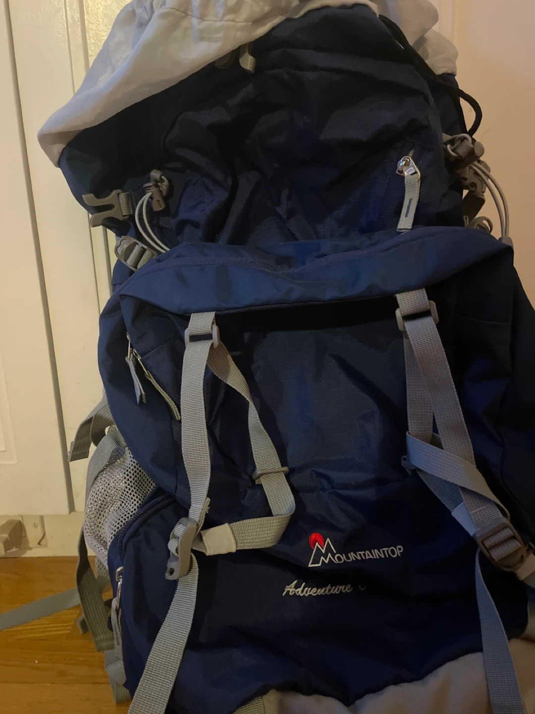 Selling a Mountaintop Adventure backpack in great condition! It's blue and gray, perfect for hiking or travel. The backpack has multiple compartments and adjustable straps for a comfortable fit. Ready for your next adventure. It is 40 L