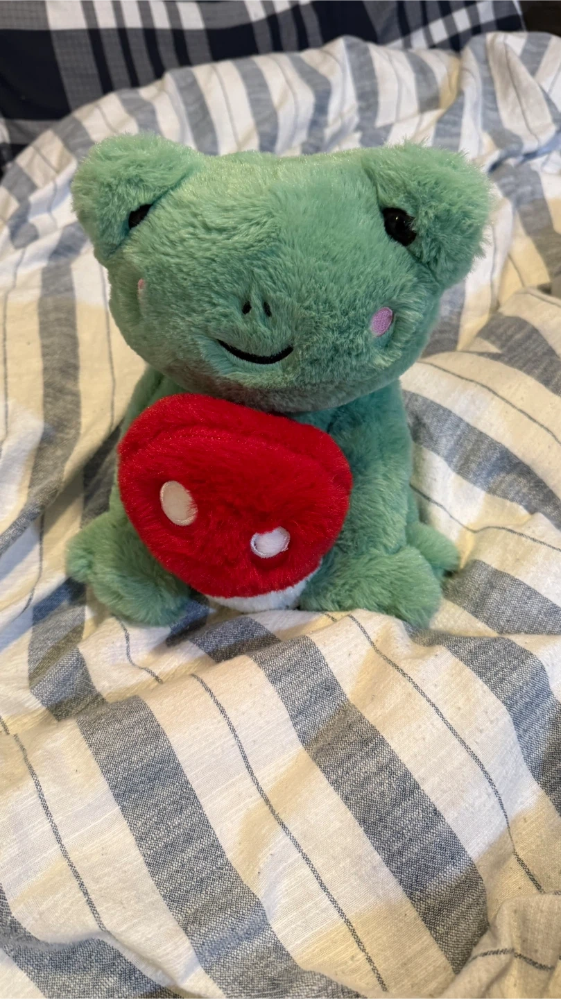 Selling a cute green frog plush toy! It's in great condition and would make a lovely addition to any collection or a sweet gift for someone special. There is a hidden heating pack at the bottom that can be microwaved.