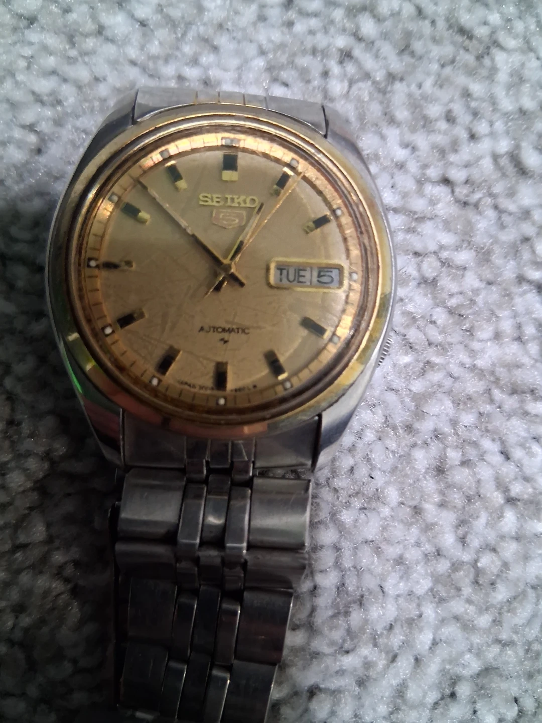 Selling a Seiko automatic watch. It has a gold-tone face and a stainless steel band. The watch displays the day of the week as well as the date. has some scratches on it can sell new for around $200 asking $40 still available if it doesn't say sold