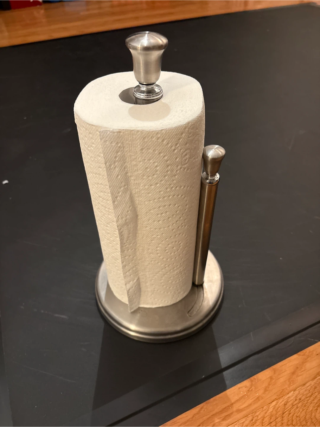 Here's a sturdy metal paper towel holder for your kitchen! It's in great shape and ready to use. It has a nice, simple design that will fit in with any decor.