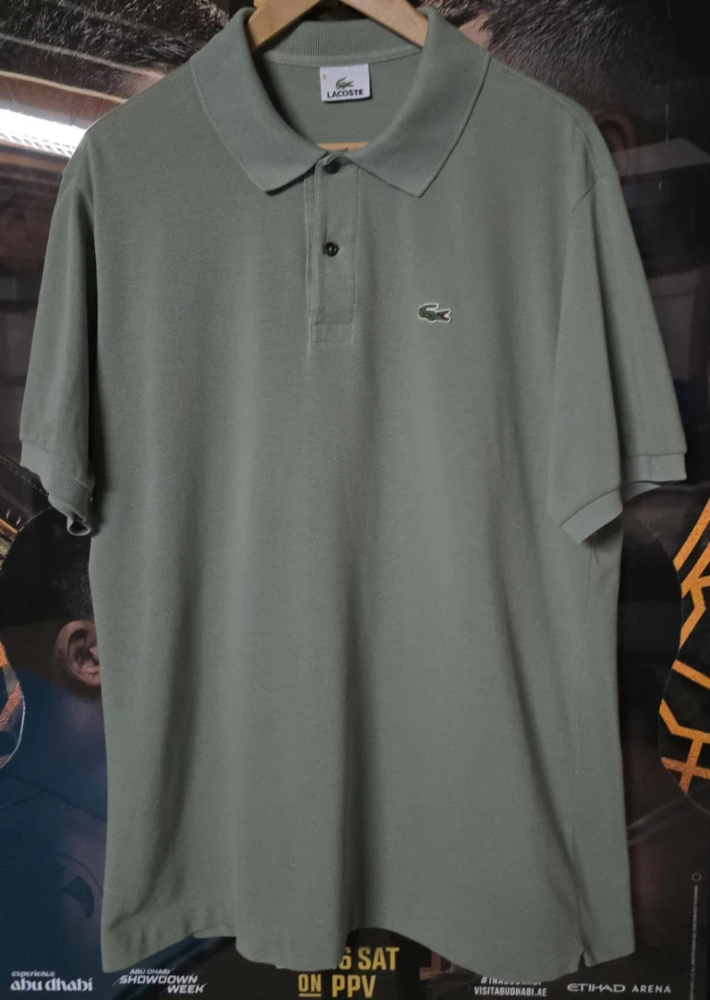 Selling a Lacoste polo shirt in size 6. It's in great condition and ready for a new home! The colour is a nice, muted green, perfect for a casual or slightly dressy look. It's a classic piece that never goes out of style