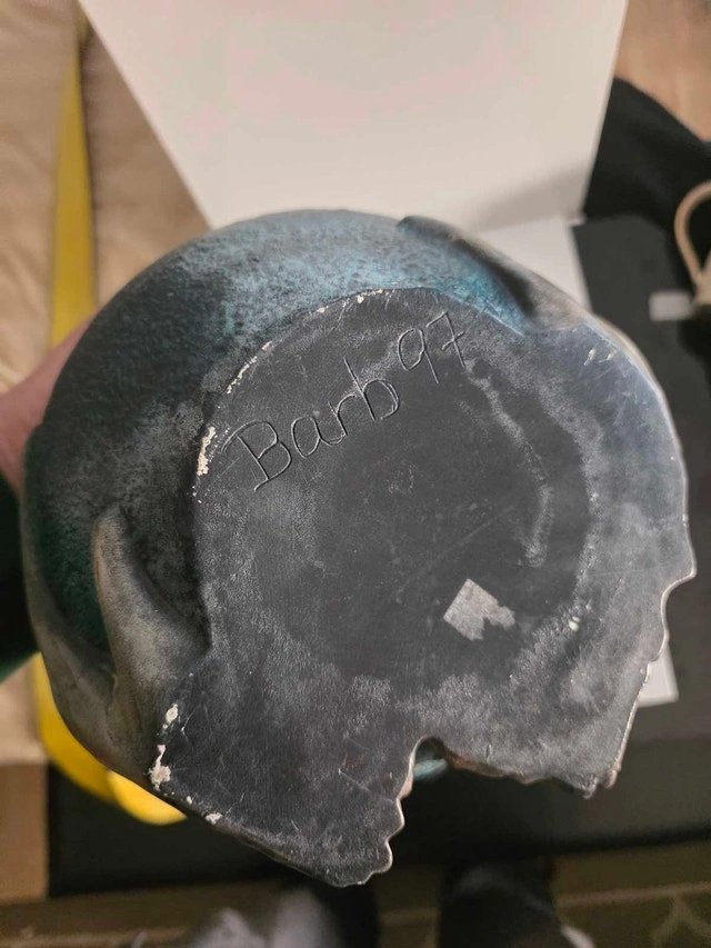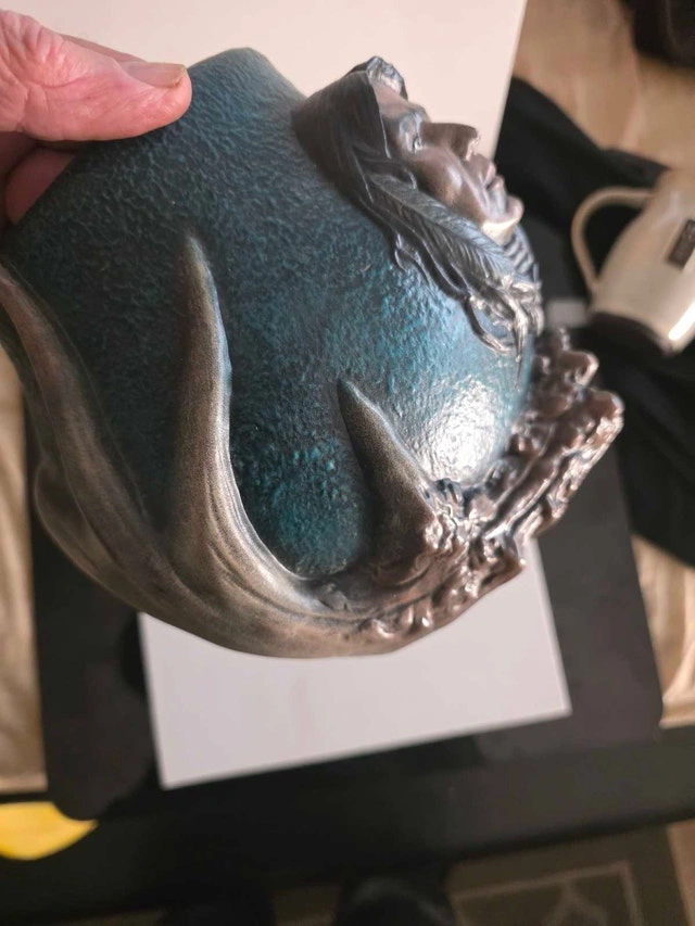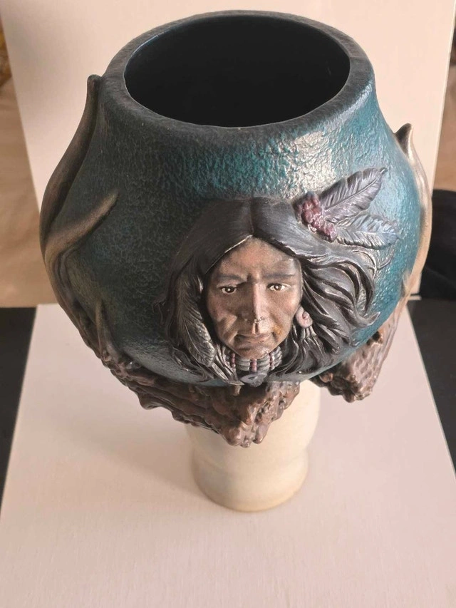 This captivating, hand-painted Indigenous ceramic piece measures 8 x 6 inches and showcases intricate detailing. It's a pre-owned item in good condition, bearing the signature "Barb 97" at the bottom, making it a unique collector's item. This piece features a striking Indigenous design and would make an excellent addition to any art collection. The artistry is really something, isn't it?