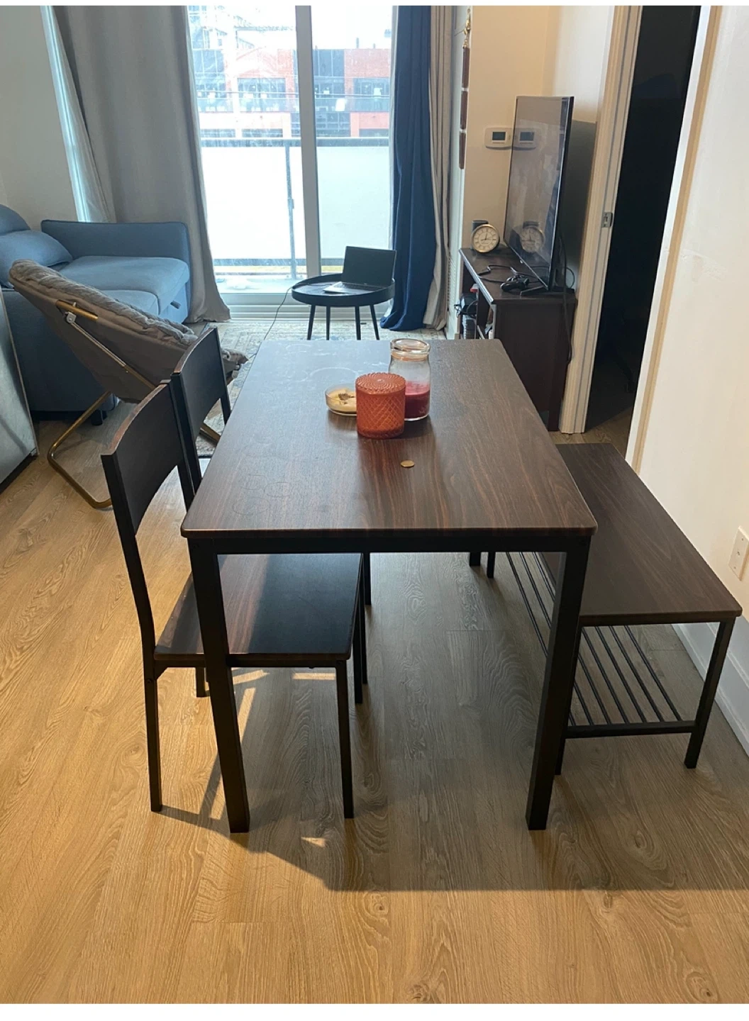 10Selling a dining table set that includes two chairs and a bench. The set features a dark wood finish with a simple, modern design. It's perfect for a small dining area or kitchen nook!