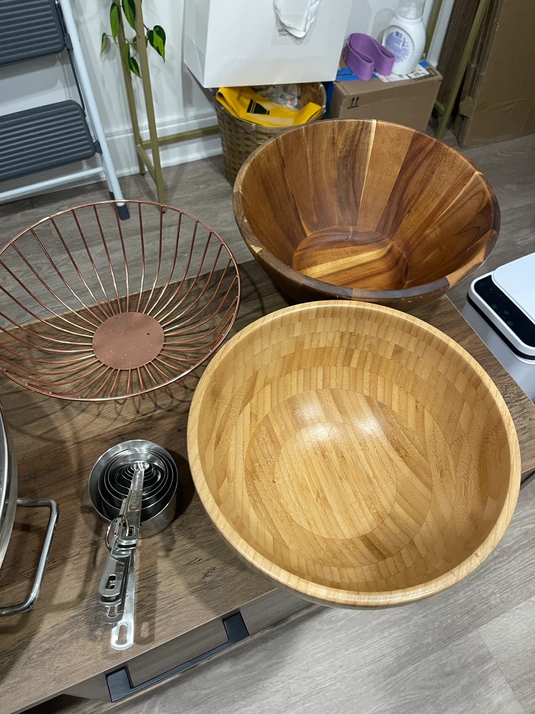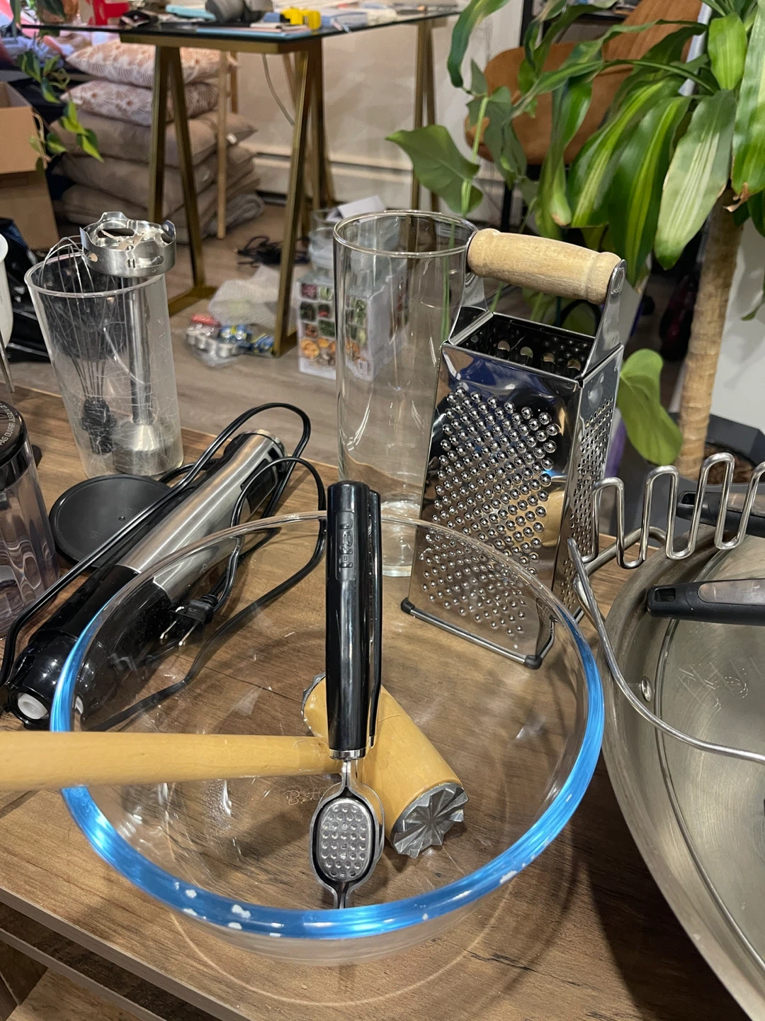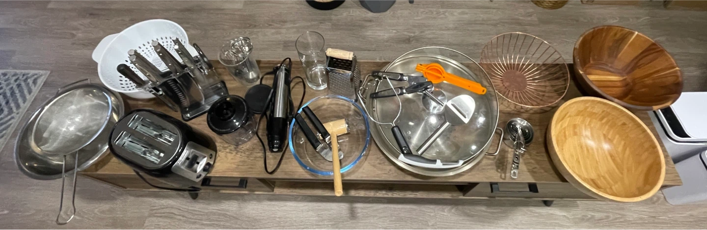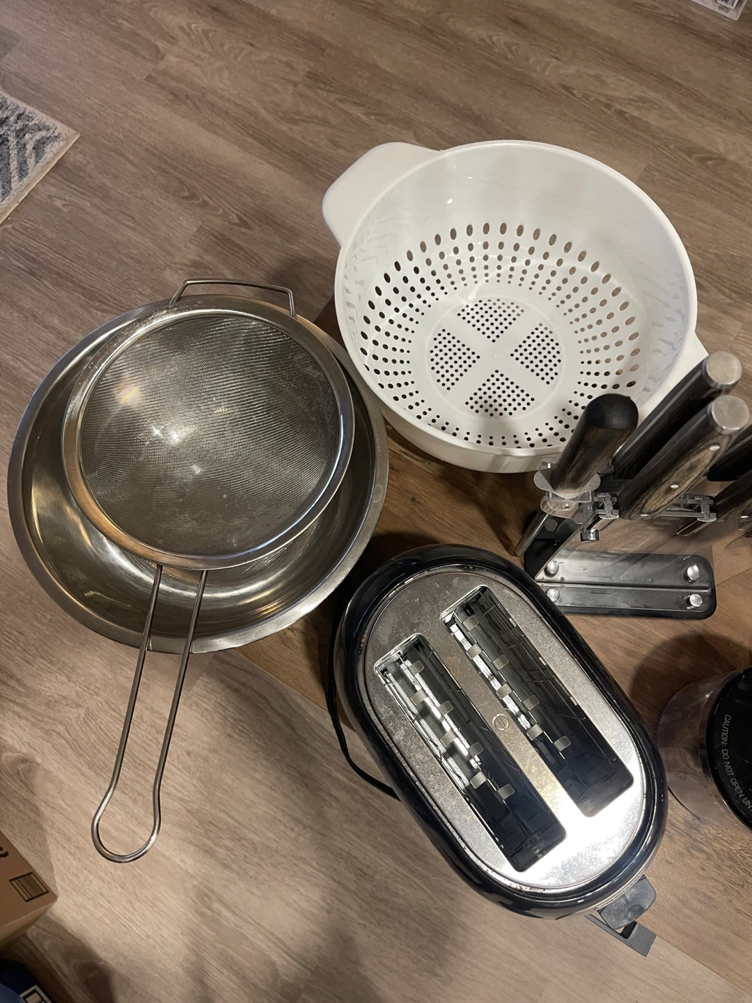 Selling a collection of various kitchen utensils! Includes items like a toaster, stick blender, knife set, wooden and metal salad / fruit bowls, wok, measuring spoons and cups set, and more. Perfect for someone setting up a new kitchen or looking to expand their cooking tools.