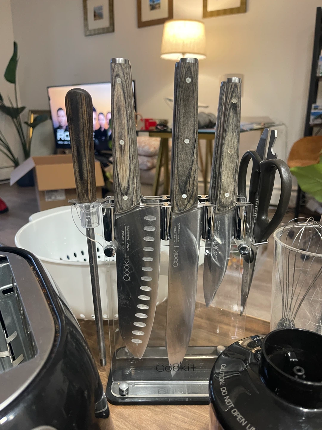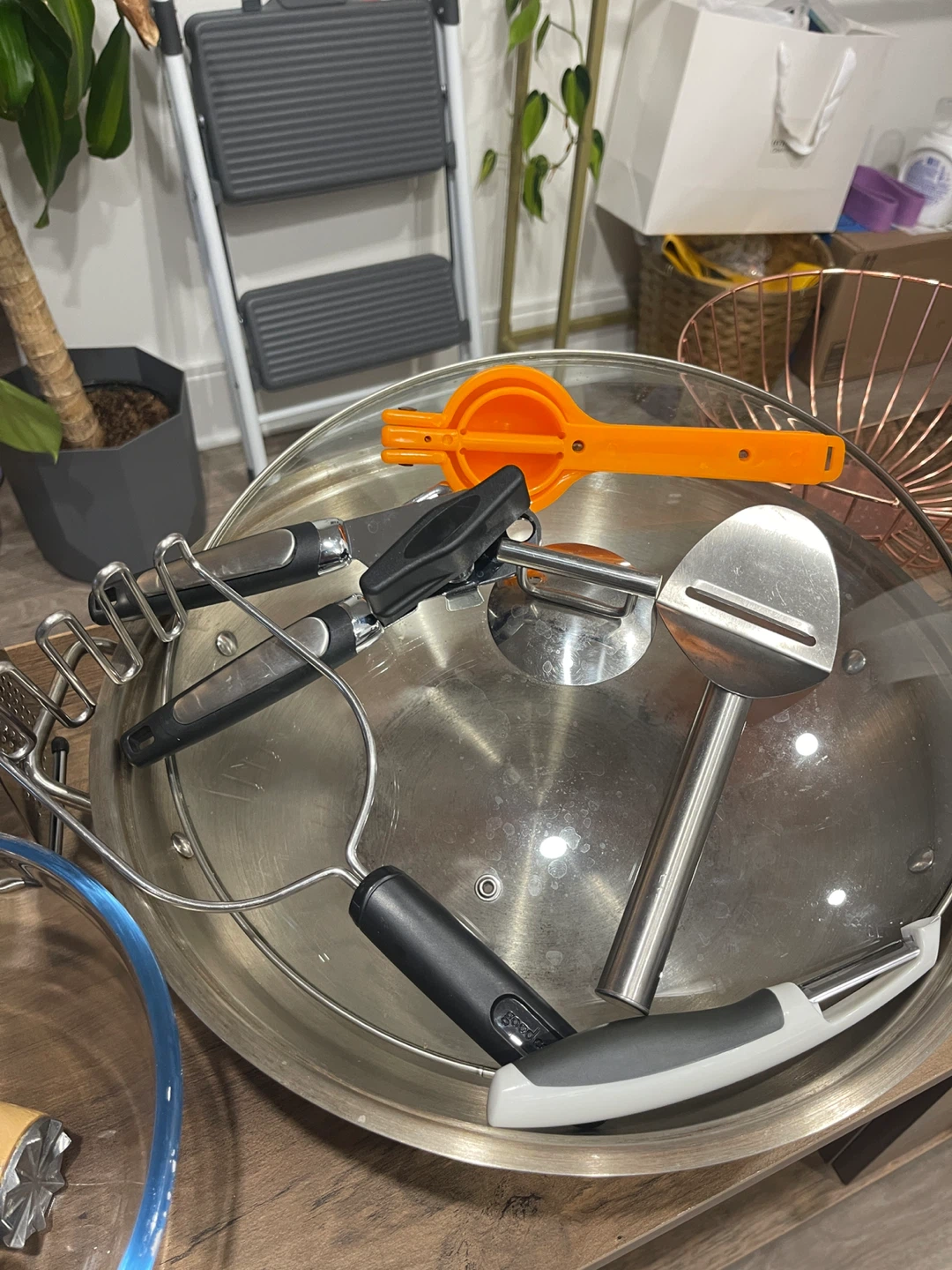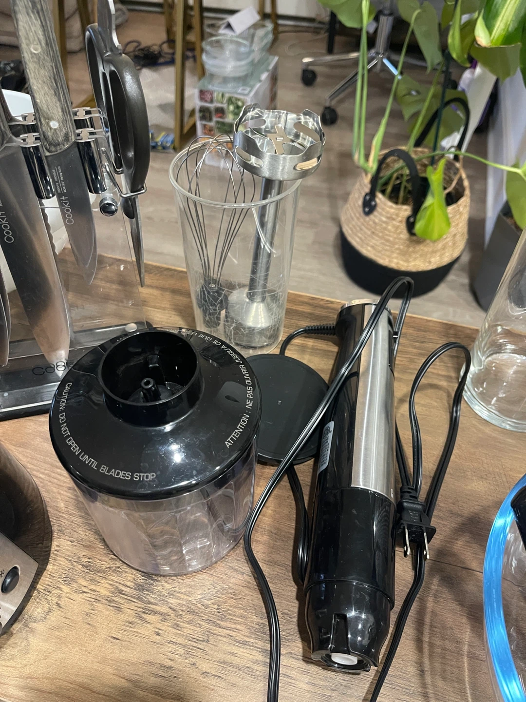 Selling a collection of various kitchen utensils! Includes items like a toaster, stick blender, knife set, wooden and metal salad / fruit bowls, wok, measuring spoons and cups set, and more. Perfect for someone setting up a new kitchen or looking to expand their cooking tools.