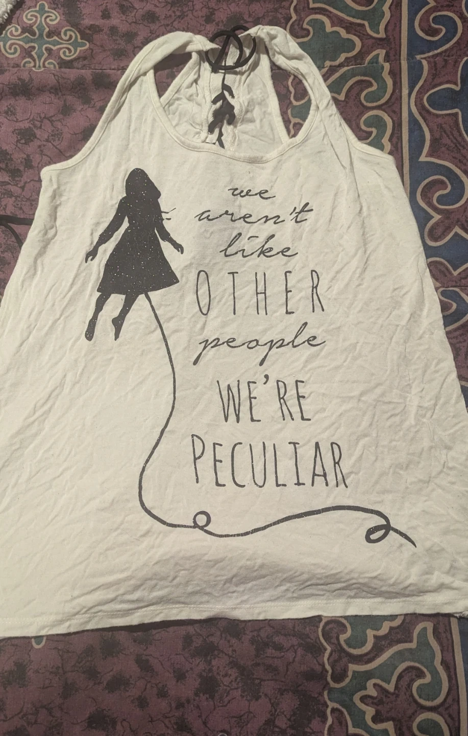49🍿 From the movie Miss Peregrine's Home for Peculiar Children! This is a white tank top with a unique design. It features a silhouette of a girl and the phrase "we aren't like OTHER people WE'RE PECULIAR" printed on the front. The back has a lace-up detail.