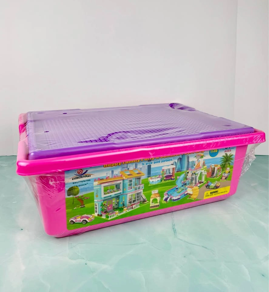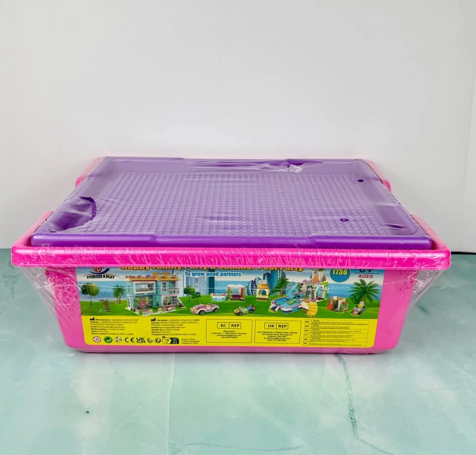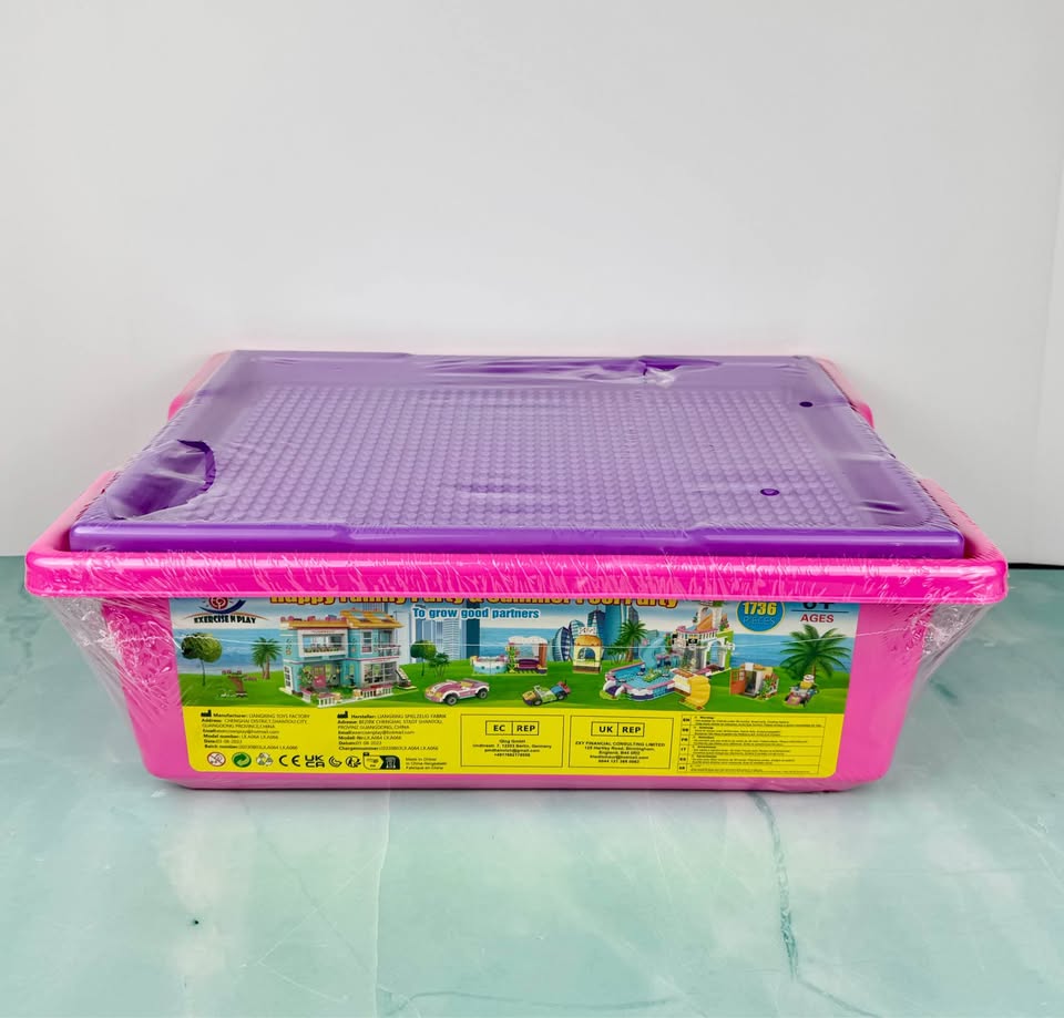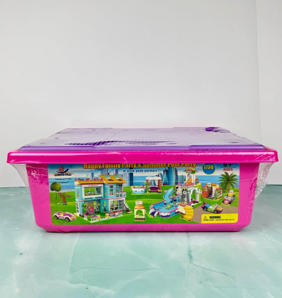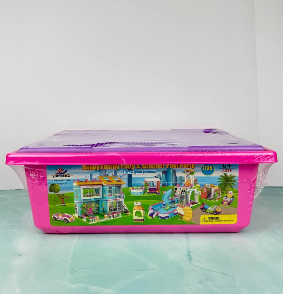 - Brand NEW, unopened building set ready for hours of creative fun. Includes everything needed to build a pool party house with bedroom, kitchen, bathroom, living room, juice shop, hot spring, and toilet. 1736 pieces total.