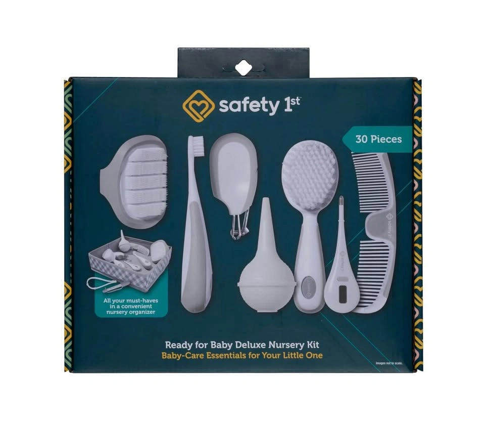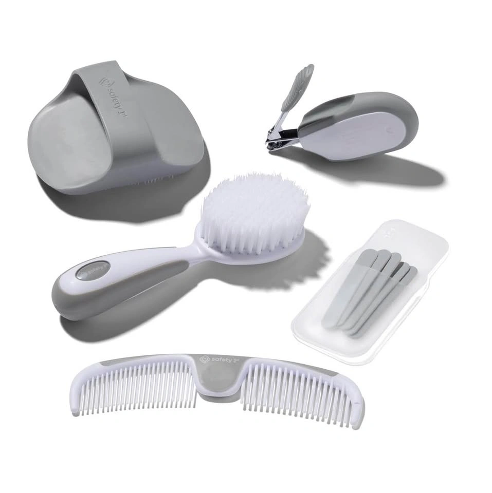 Health & Grooming Essentials: Digital 3-in-1 thermometer, steady grip nail clipper, easy-grip brush and comb, toddler toothbrush, and medicine dispenser.